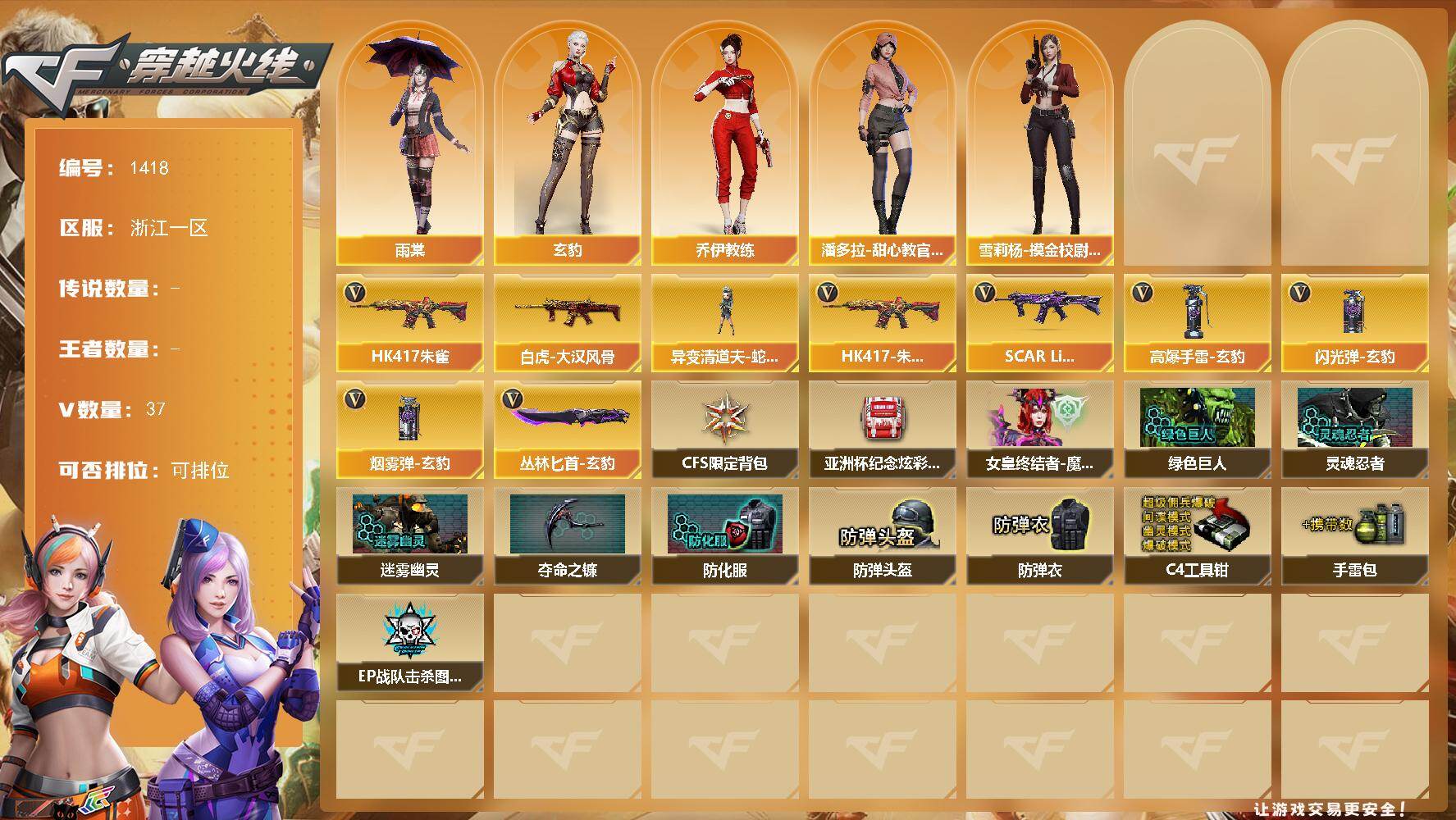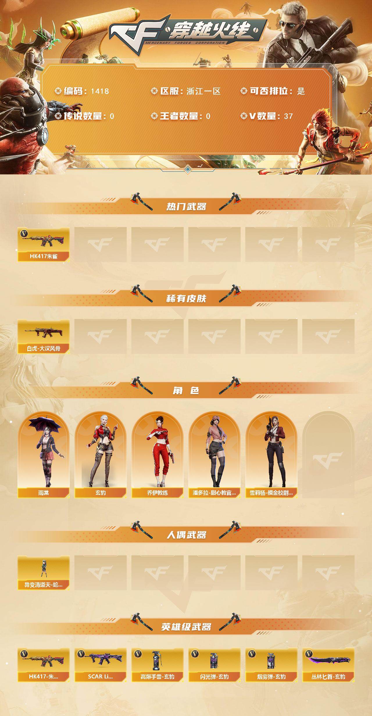 【395733】【395733】浙江一区-37V-0王者-0炫金【热门武器】:HK417-朱雀【皮肤】:白虎-大汉风骨【角色】:雨棠,玄豹,乔伊教练,潘多拉-