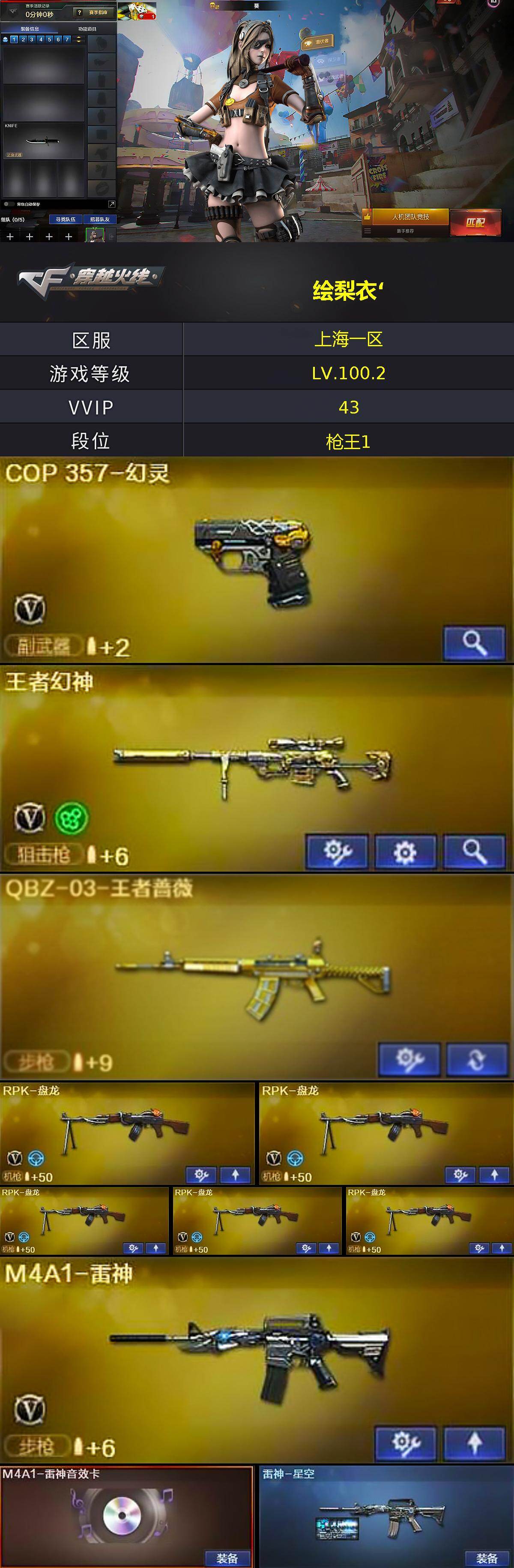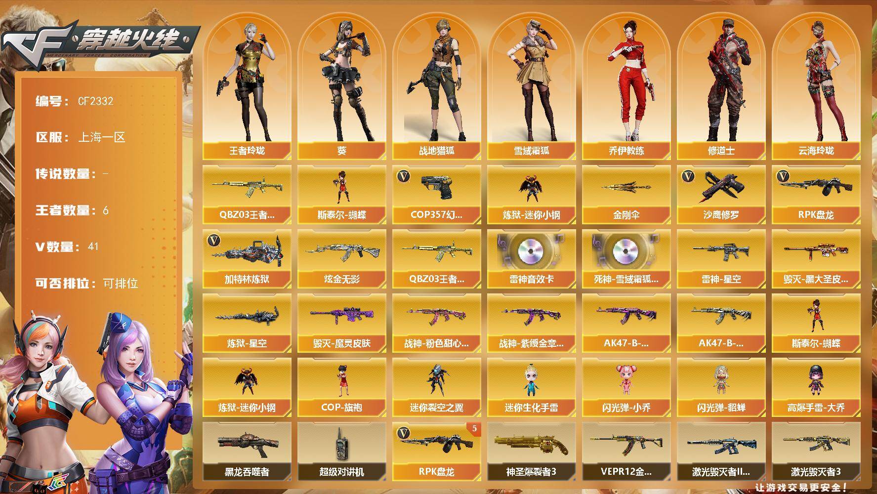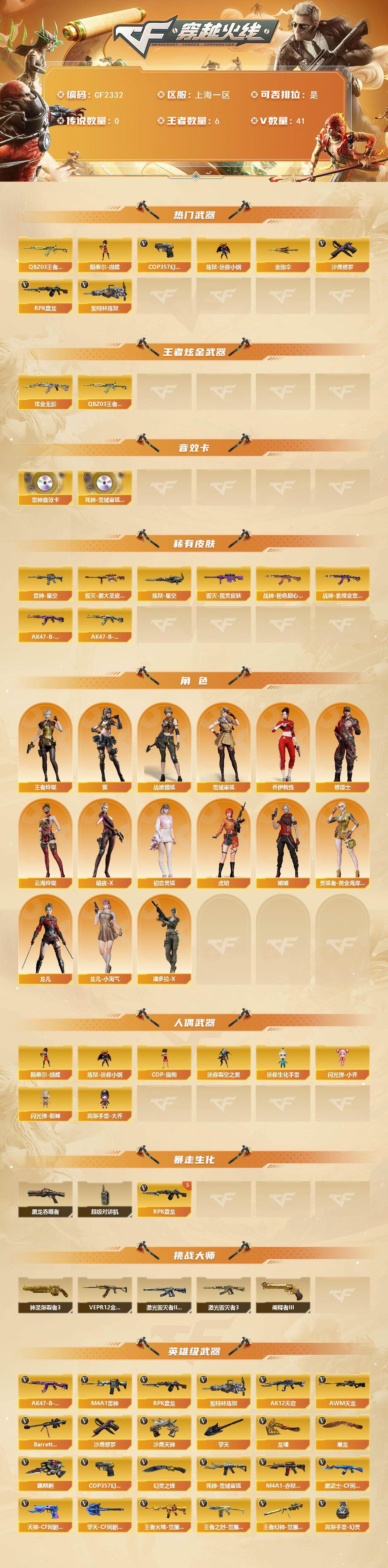 【395870】【395870】【CF2332】上海一区-41V-6王者-1炫金【双全号 QBZ-03-王者蔷薇,炼狱-迷你小钢,RPK-盘龙*5,加特林-炼