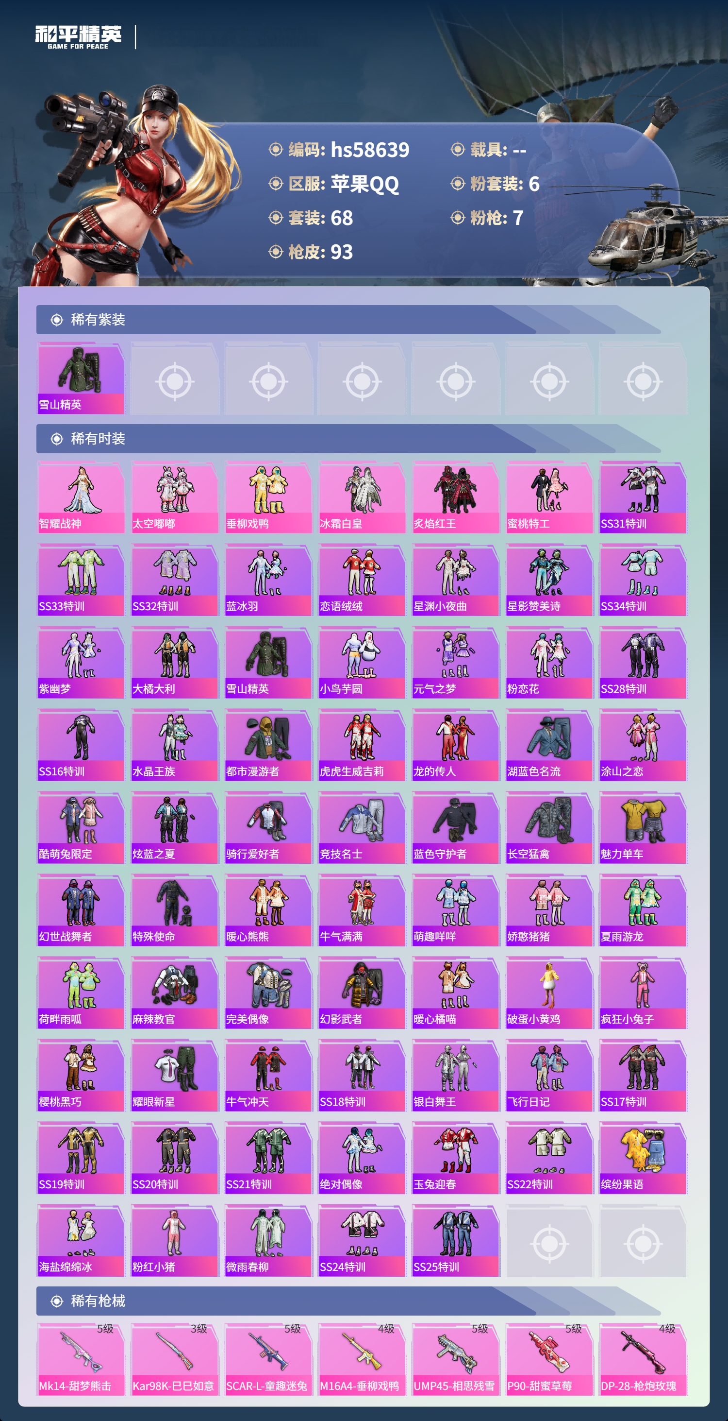 【395907】【不可二次】【苹果QQ】DP-28-枪炮玫瑰 M16A4-垂柳戏鸭 蜜桃特工 太空嘟嘟飞行器 DP28-枪炮玫瑰 UMP45-相思残雪 炙焰红王 粉红小猪 SCAR-童趣迷兔 P90-甜蜜草莓 冰霜白皇 雪山精英
