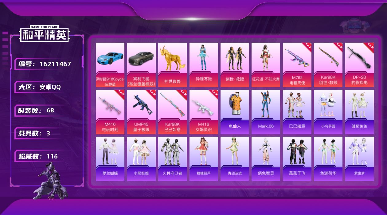 【395920】[16211467]安卓【男神号 角色-Mark.06/套装-龟仙人/M762-电糖天使(七级)/M416-电玩时刻(五级)/UMP45-量子极限(五级)/Kar98K-创世·救赎(六级)/宾利飞驰(布罗德盖棕双色)/保时捷918 Spyder(沉静蓝)】 手Q-3粉装-7特效枪-3载具-7粉色飞行器-42560热力值-9王牌印记-68套装-116枪皮【热门品类】:套装-龟仙人,