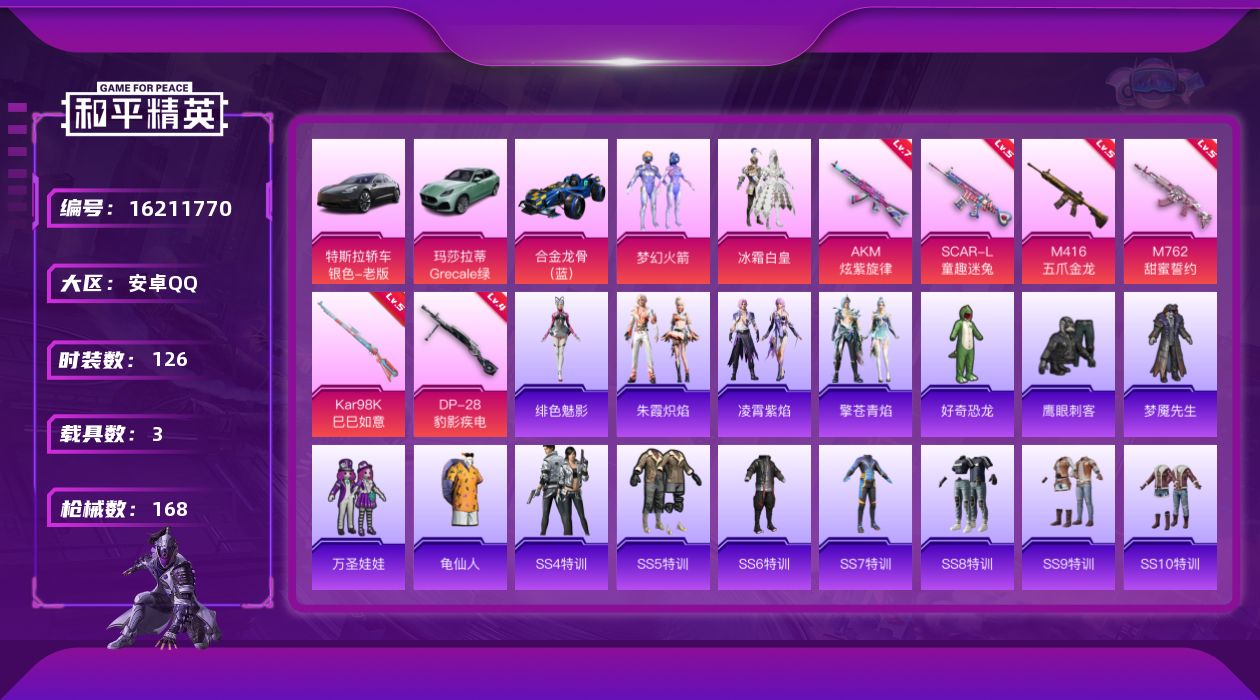【395958】【可二次】【安卓QQ】合金龙骨蓝色 AKM-炫紫旋律 M762甜蜜誓言 梦幻火箭 M416-五爪金龙 SCAR-童趣迷兔