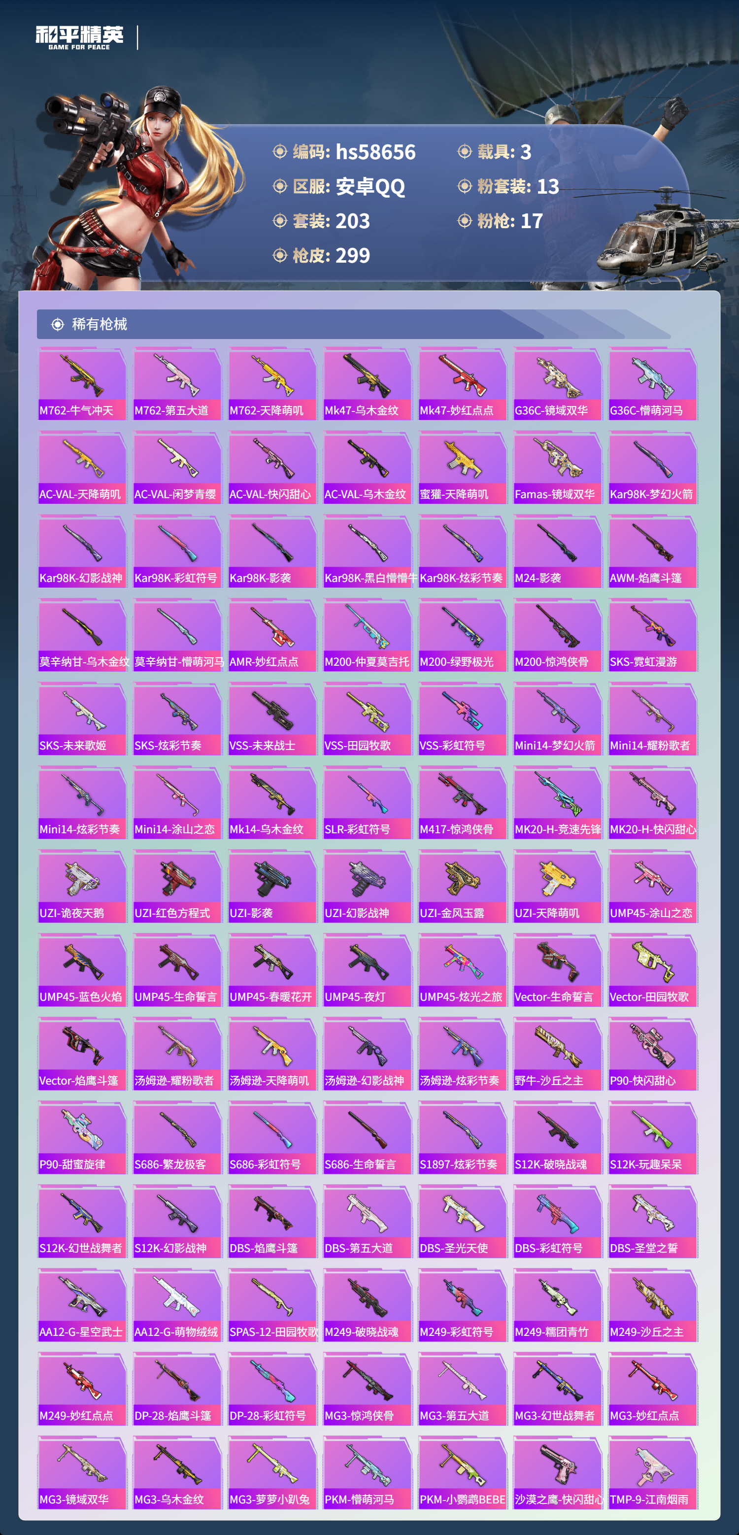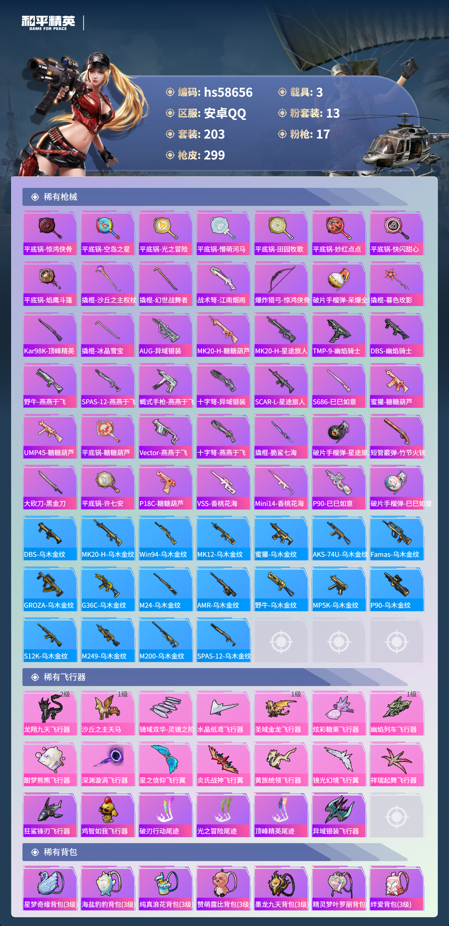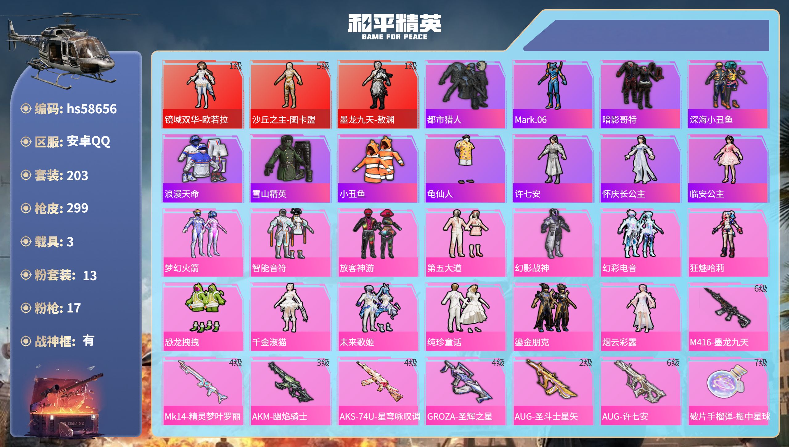 【395961】【可二次】【安卓QQ】合金龙骨蓝色 龟仙人 MK14-精灵梦叶罗丽 恐龙拽拽 M416-五爪金龙 漫步者 都市猎人 炎氏战神飞行翼 忍者信条 镜域双华-欧若拉 沙丘之主-图卡盟 放客神游 墨龙九天-敖渊 深海小丑鱼 智能音符 浪漫天命 镜光幻境飞行翼 M24-镜域双华 新侠客行 UMP45-宇宙意志 M417射手步枪 狂沙舞者 龙翔九天飞行器 黄族统领飞行器 M416-墨龙九天