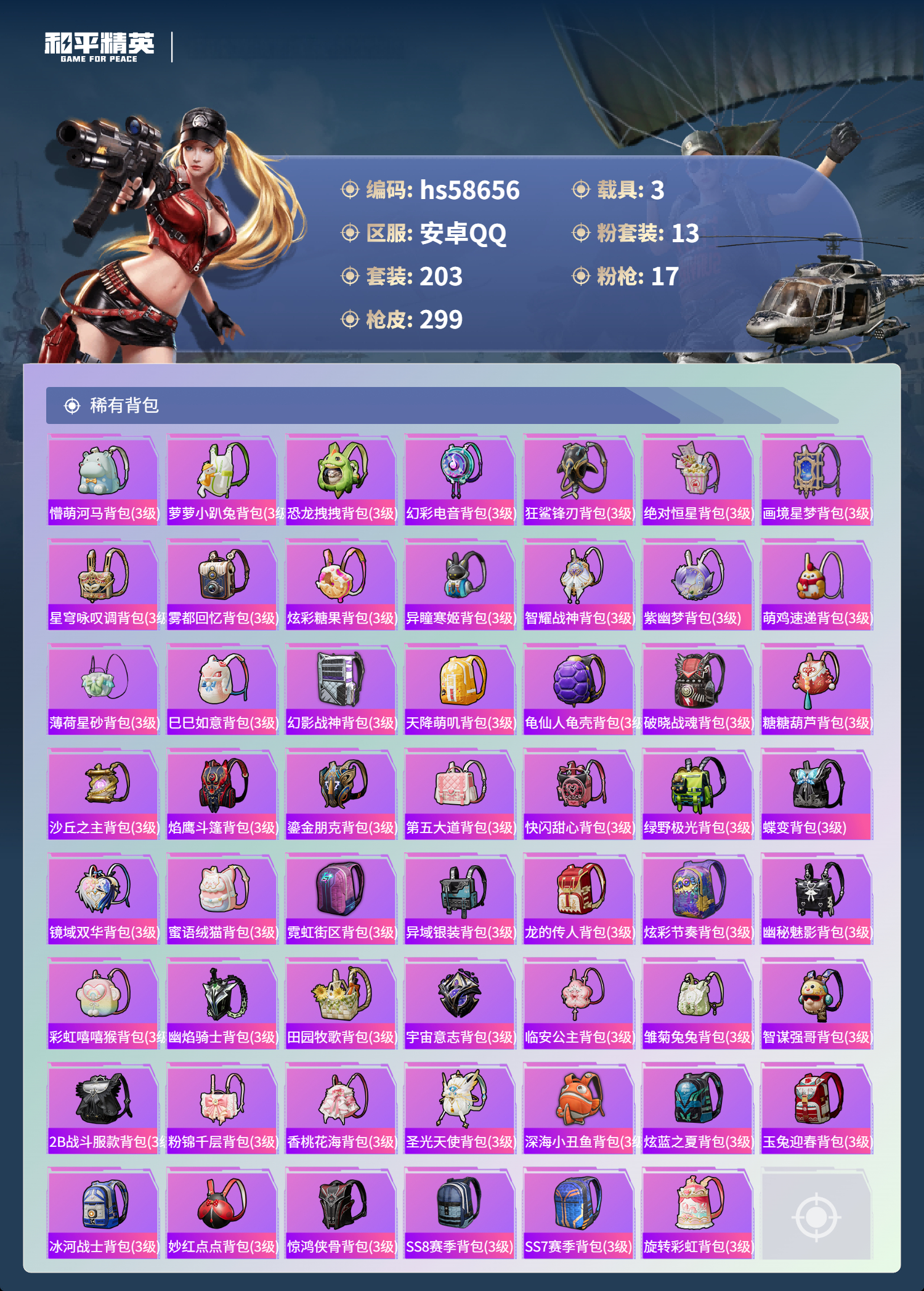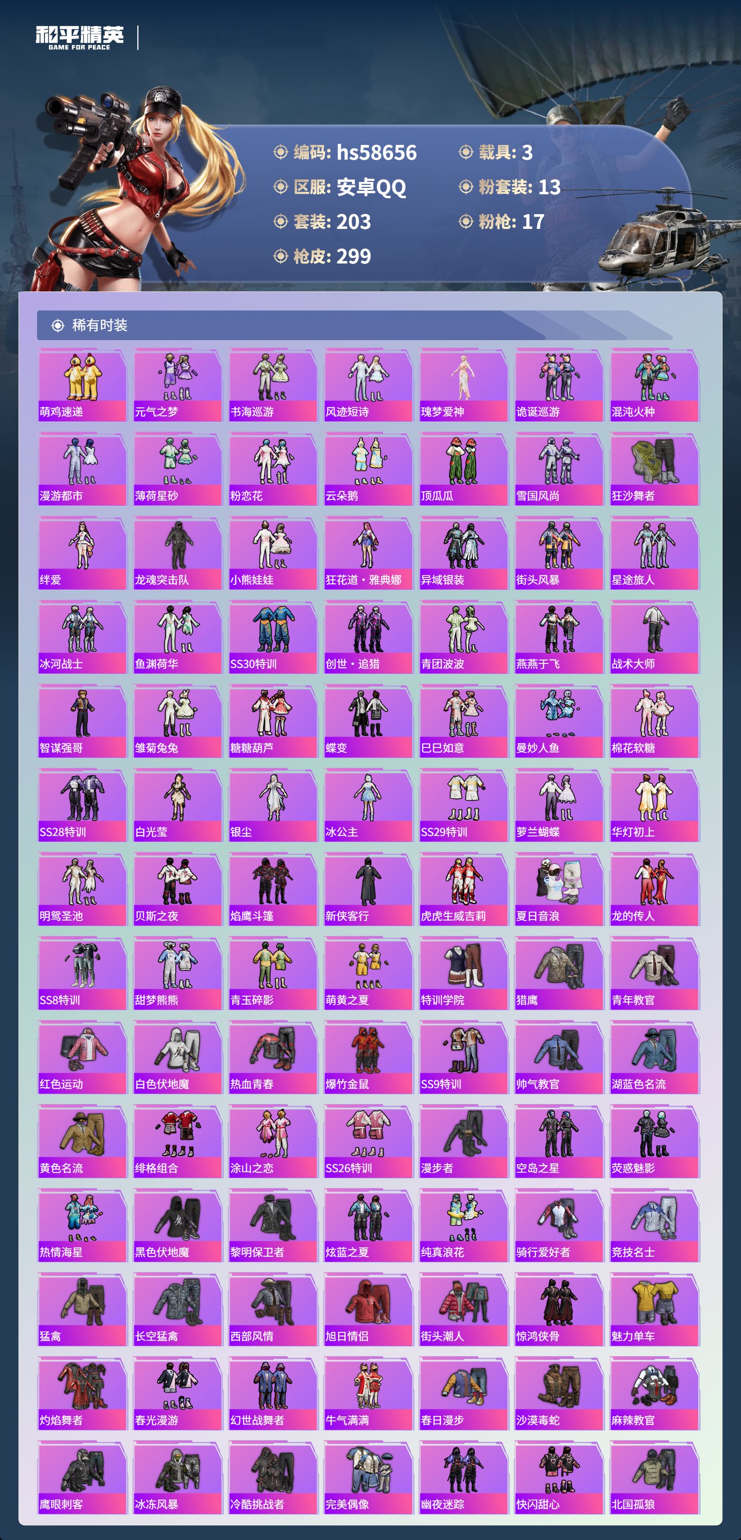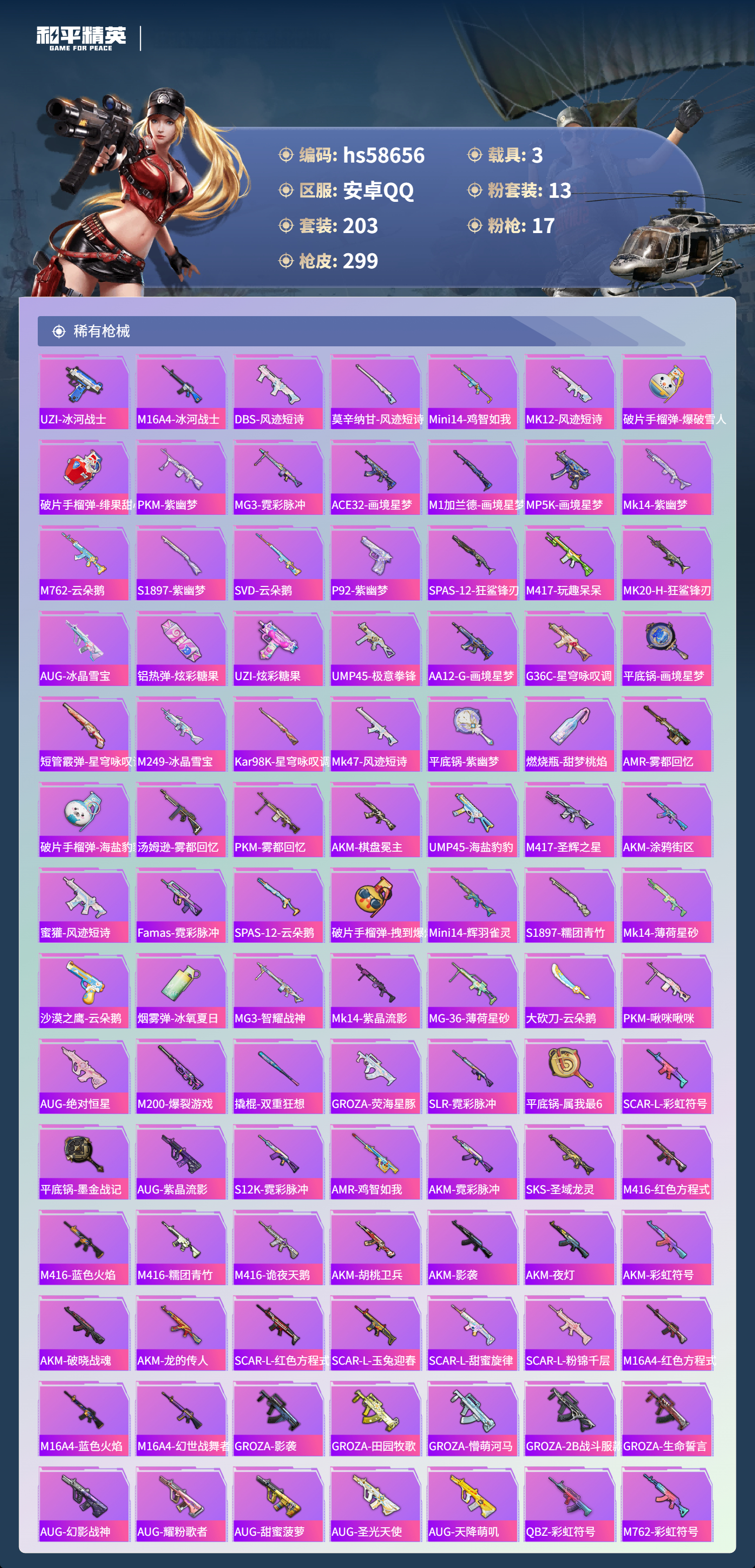 【395961】【可二次】【安卓QQ】合金龙骨蓝色 龟仙人 MK14-精灵梦叶罗丽 恐龙拽拽 M416-五爪金龙 漫步者 都市猎人 炎氏战神飞行翼 忍者信条 镜域双华-欧若拉 沙丘之主-图卡盟 放客神游 墨龙九天-敖渊 深海小丑鱼 智能音符 浪漫天命 镜光幻境飞行翼 M24-镜域双华 新侠客行 UMP45-宇宙意志 M417射手步枪 狂沙舞者 龙翔九天飞行器 黄族统领飞行器 M416-墨龙九天