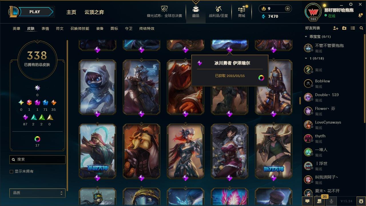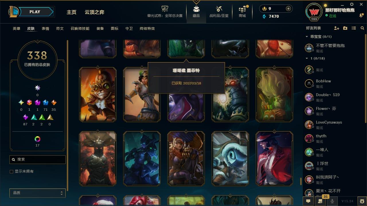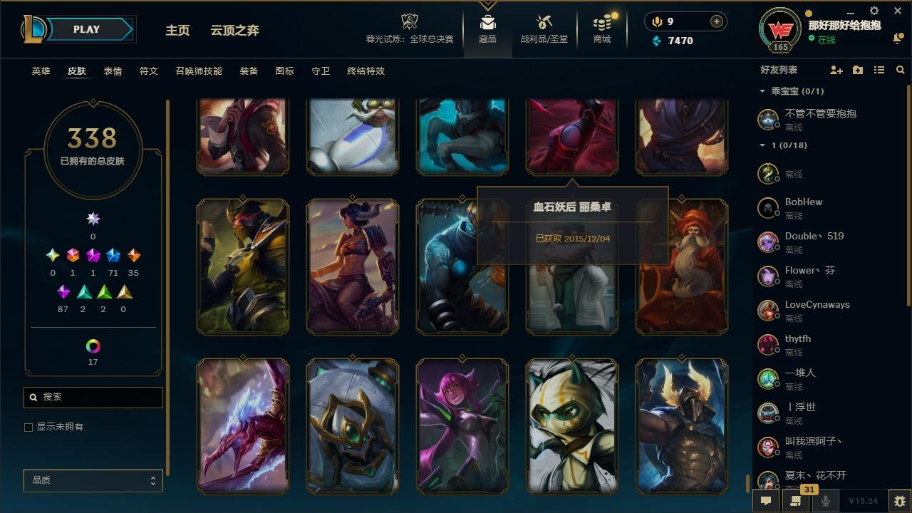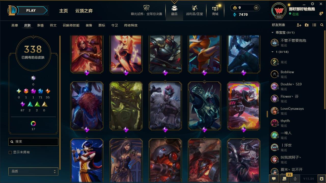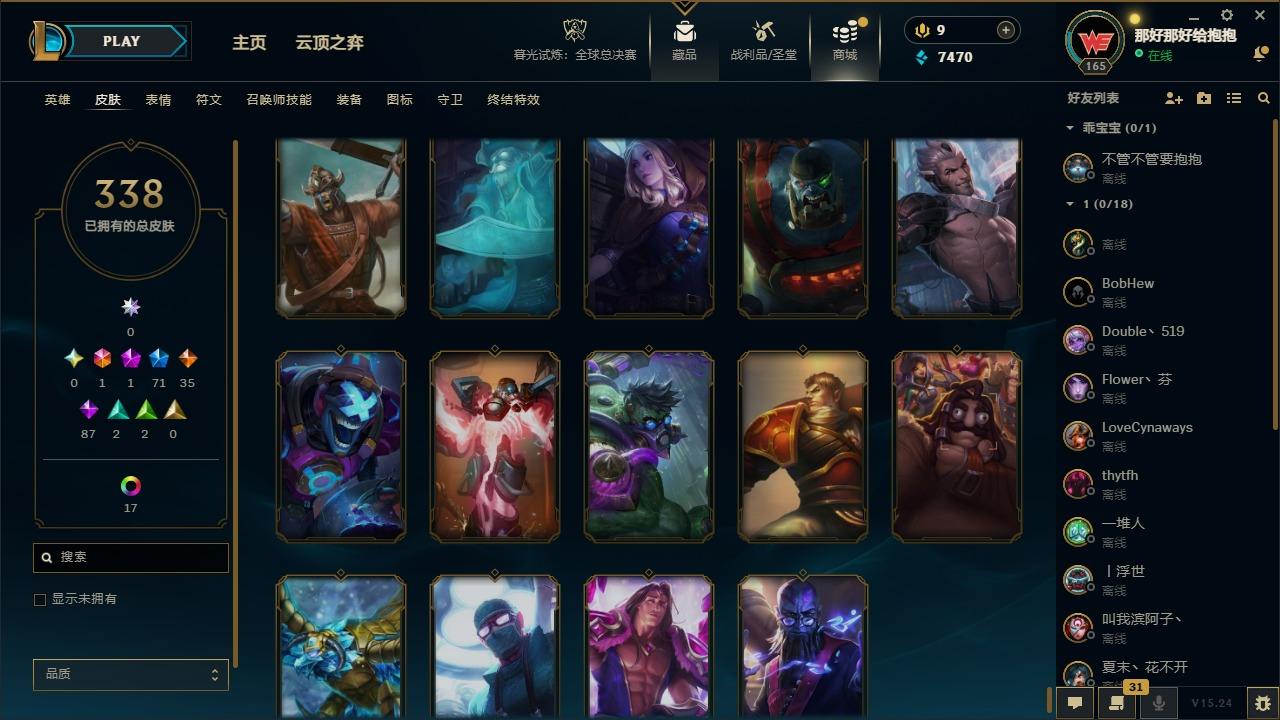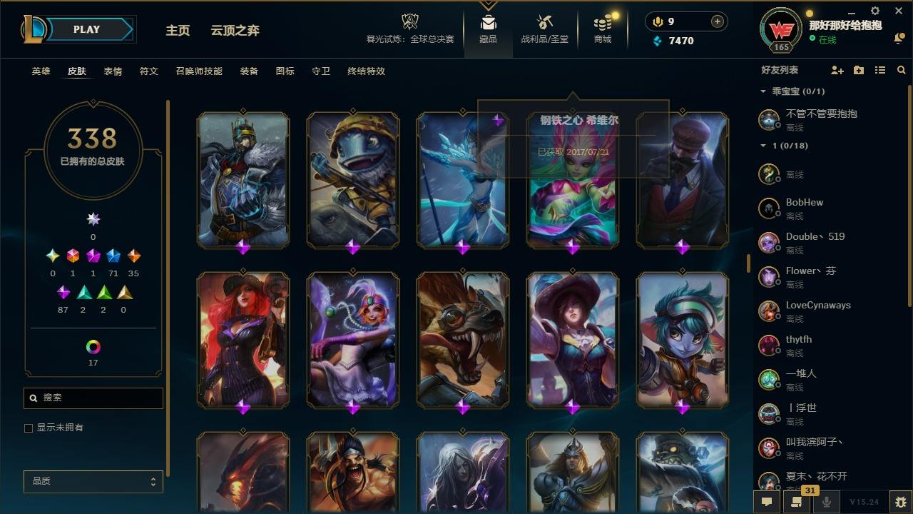 【397587】[16221351]1终极 1神话 71限定 35传说 87史诗 338皮肤 24炫彩 161英雄 可二次 可修改实名 【情人节限定】觅心猎手 薇恩【赛季限定皮】胜利凤凰 艾尼维亚,胜利之王 泰达米尔,胜利女神 希维尔,胜利之树 茂凯,胜利枪神 格雷福斯,胜利女神 奥莉安娜,胜利之剑 亚托克斯【冠军限定系列】S1FNC 嘉文四世,S1FNC 卡尔萨斯,S2 暗杀星 发条,S2 暗