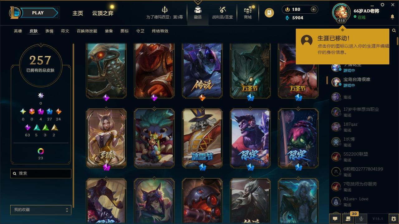 【397605】[16221445]4神话 27限定 24传说 63史诗 257皮肤 27炫彩 166英雄 可二次 可修改实名 【至臻】至臻 K/DA 阿狸【海克斯】海克斯 克格莫【赛季限定皮】胜利之剑 亚托克斯【冠军限定系列】S2 暗杀星 蒙多,S2 暗杀星 努努,S4 SSW 图奇【冰雪节限定】冰雪风暴 希维尔,冰雪节 辛吉德,冰雪兽 纳尔,胡桃夹子 萨科,平安夜女神 娑娜【泳池派对】泳池派