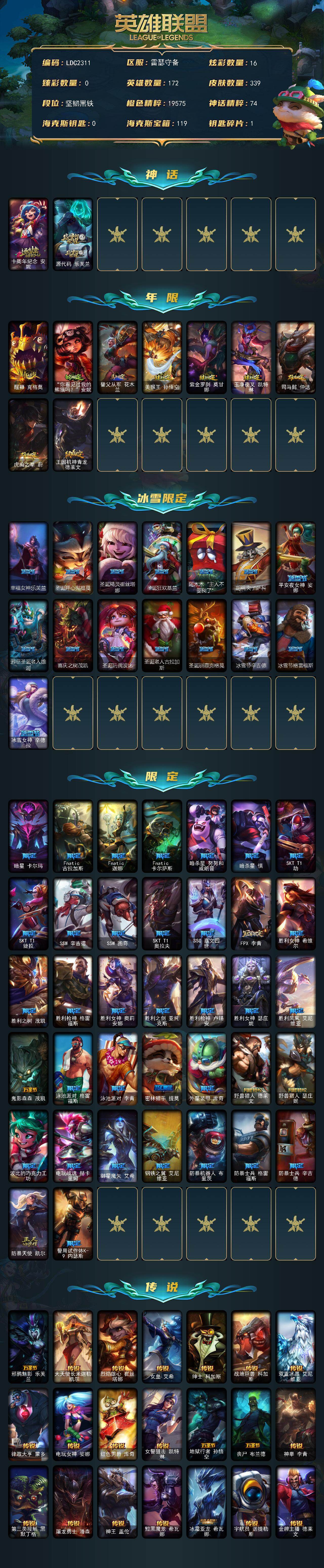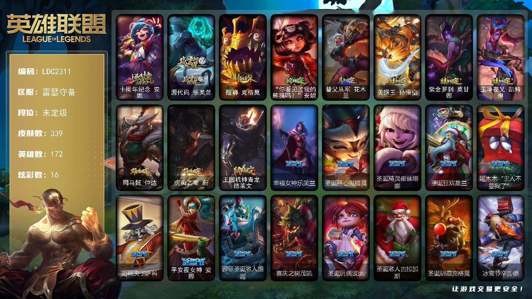 【402193】【LDC2311】172英雄/339皮肤/2神话/61限定/16炫彩/22传说/88史诗/未定级/十周年纪念安妮/源代码乐芙兰/醒狮克格莫/“你看见过我的熊猫吗?”安妮/替父从军花木兰/美猴王孙悟空/紫金罗刹莫甘娜/玉净夜叉凯特琳/司马懿仲达/虎痴之拳蔚/王国机神青龙德莱文/幸福女神乐芙兰/圣诞开心鬼提莫/圣诞精灵崔丝塔娜/圣诞狂欢基兰/阿木木:“主人不要我了”/胡桃夹子萨科/平