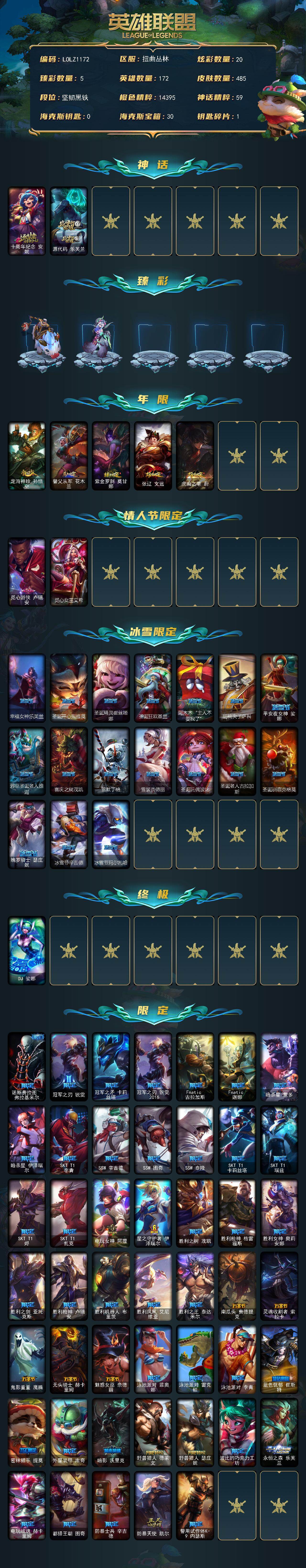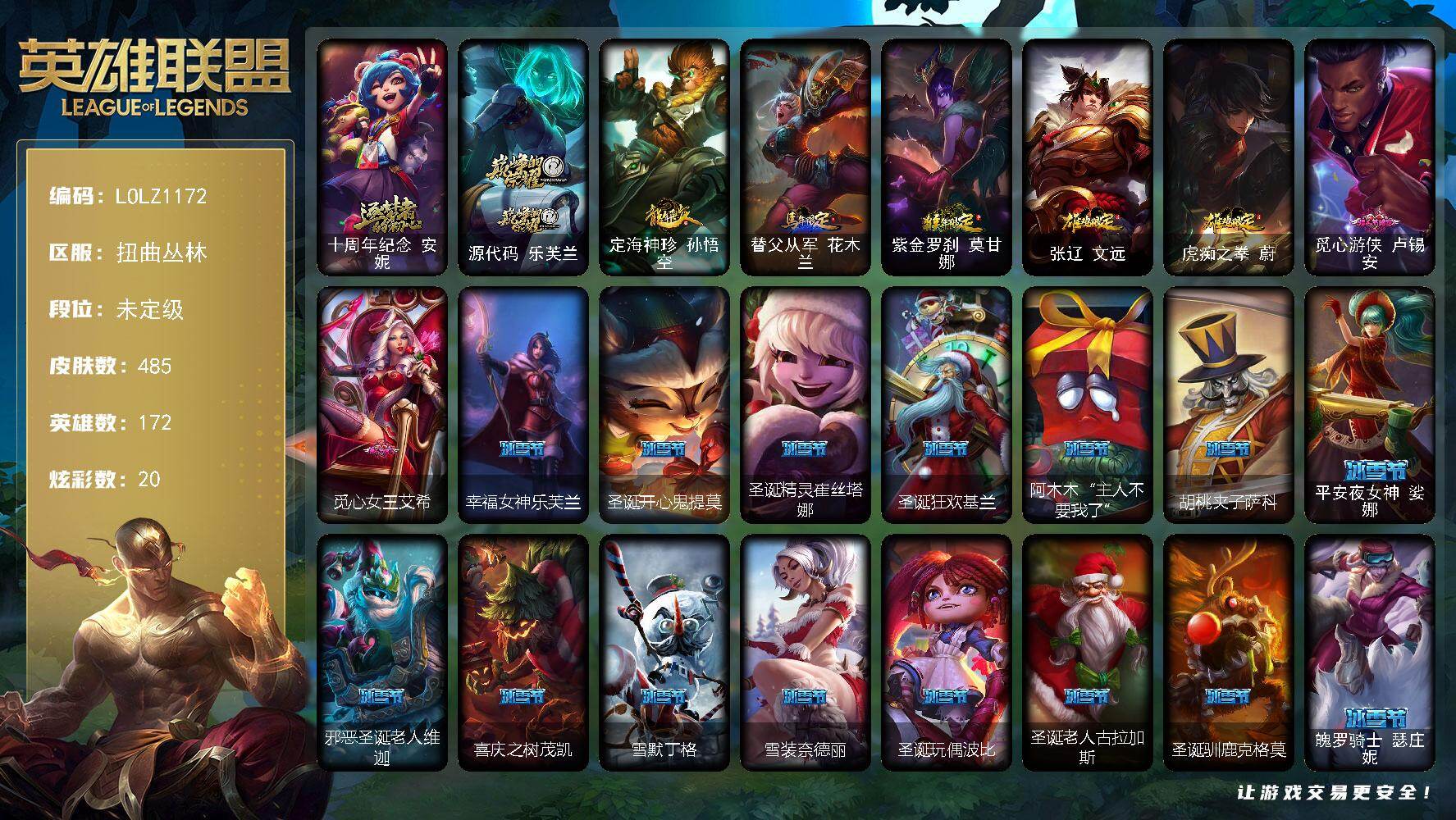 【404951】【LOLZ1172】172英雄/485皮肤/1终极/2神话/71限定/5臻彩/20炫彩/35传说/128史诗/未定级/十周年纪念安妮/源代码乐芙兰/天龙之子卡莎飞龙乘云/无畏骑士瑟庄妮赤子初心/墨之影武者亚索金墨耀影/魔女阿卡丽虚荣/净雪之月莫甘娜冬虹/定海神针孙悟空/替父从军花木兰/紫金罗刹莫甘娜/张辽文远/虎痴之拳蔚/觅心游侠卢锡安/觅心女皇艾希/幸福女神乐芙兰/圣诞开心鬼提