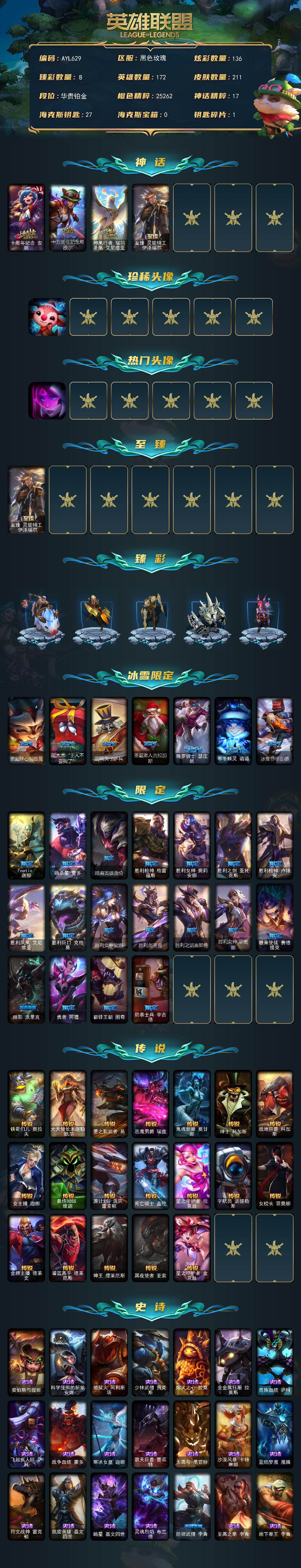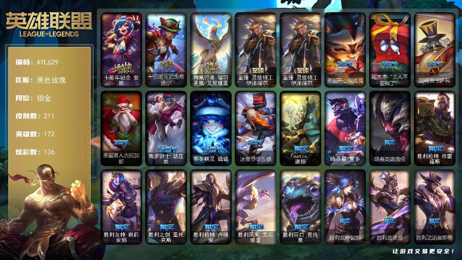 【405063】[16276472]【店主推荐捡漏号】铂金段位-172英雄-211皮肤-136炫彩-0终极-4神话-26限定-19传说-46史诗【神话皮肤】:十周年纪念安妮,十五周年纪念希维尔,神凰行者瑞羽圣凰艾尼维亚,至臻灵能特工伊泽瑞尔【珍稀头像】:至爱的鹿头像【热门头像】:源计划刀妹头像【至臻皮肤】:至臻灵能特工伊泽瑞尔【臻彩皮肤】:无畏骑士瑟庄妮赤子初心,征服者韦鲁斯炫金,冠军之隐劫凯旋
