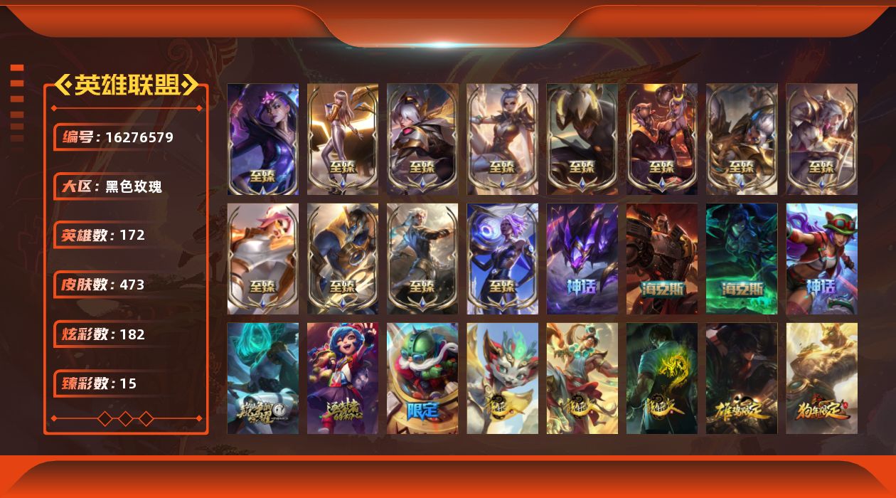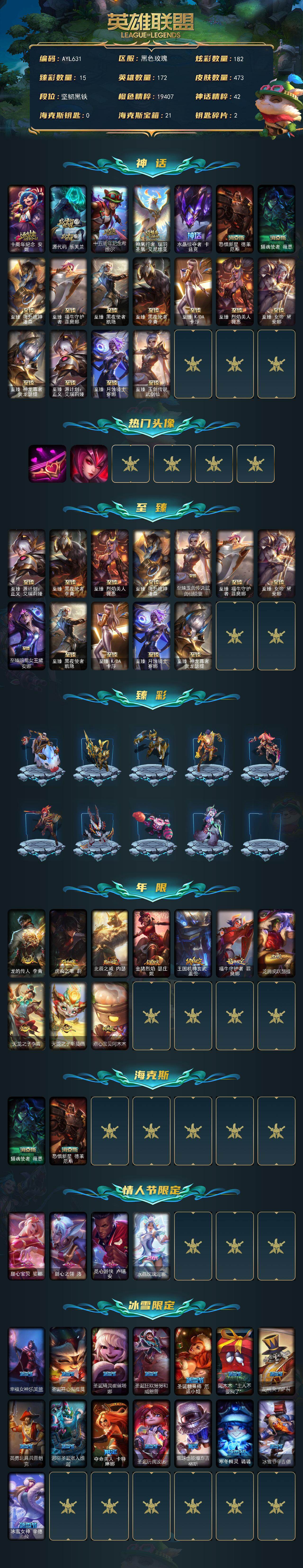 【405071】[16276579]【店主推荐捡漏号】未定级段位-172英雄-473皮肤-182炫彩-0终极-19神话-76限定-59传说-99史诗【神话皮肤】:十周年纪念安妮,源代码乐芙兰,十五周年纪念希维尔,神凰行者瑞羽圣凰艾尼维亚,水晶掠夺者卡兹克,恐惧新星德莱厄斯,摄魂使者薇恩,至臻飞升战神潘森,至臻福牛守护者菲奥娜,至臻黑夜使者凯隐,至臻黑夜使者李青,至臻KDA卡莎,至臻烈焰美人薇恩,