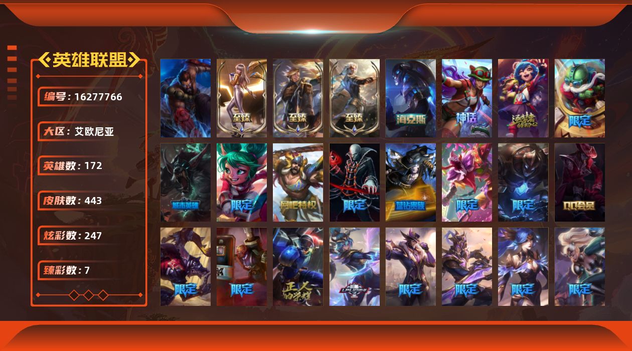 【405205】[16277766]【特价出售/店主推荐】白银段位-172英雄-443皮肤-247炫彩-1终极-6神话-49限定-31传说-108史诗【至臻皮肤】:至臻灵能特工伊泽瑞尔,至臻黑夜使者凯隐,至臻KDA卡莎【臻彩皮肤】:天龙之子卡莎飞龙乘云,墨之影武者亚索金墨耀影,冠军掠夺者卡兹克凯旋圣装,幻灵战斗猫金克丝梦幻强袭,泳池派对奥莉安娜优雅珠光鲸,魔女阿卡丽虚荣,净雪之月莫甘娜冬虹【海克