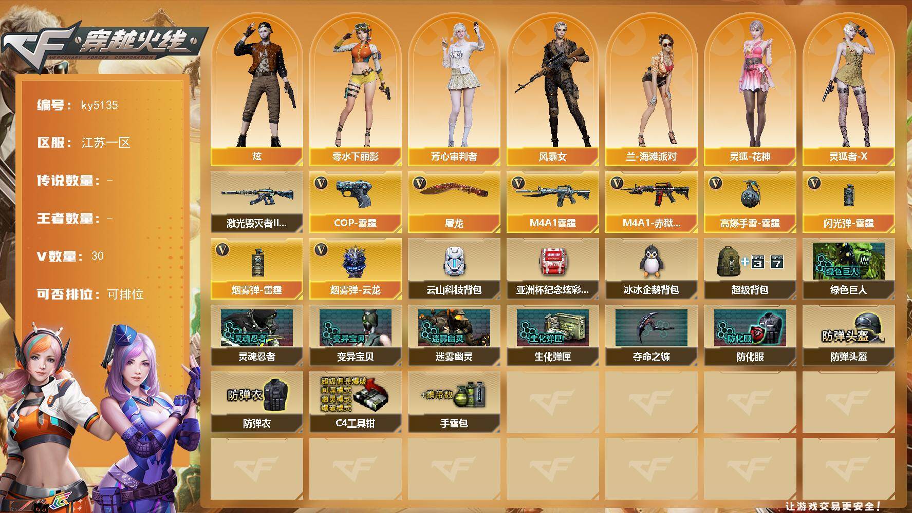 【405211】【405211】江苏一区-31V-0王者武器数-0炫金武器数【角色】:炫,芳心审判者,风暴女,兰-海滩派对,零-水下丽影,灵狐-花神,灵狐者-