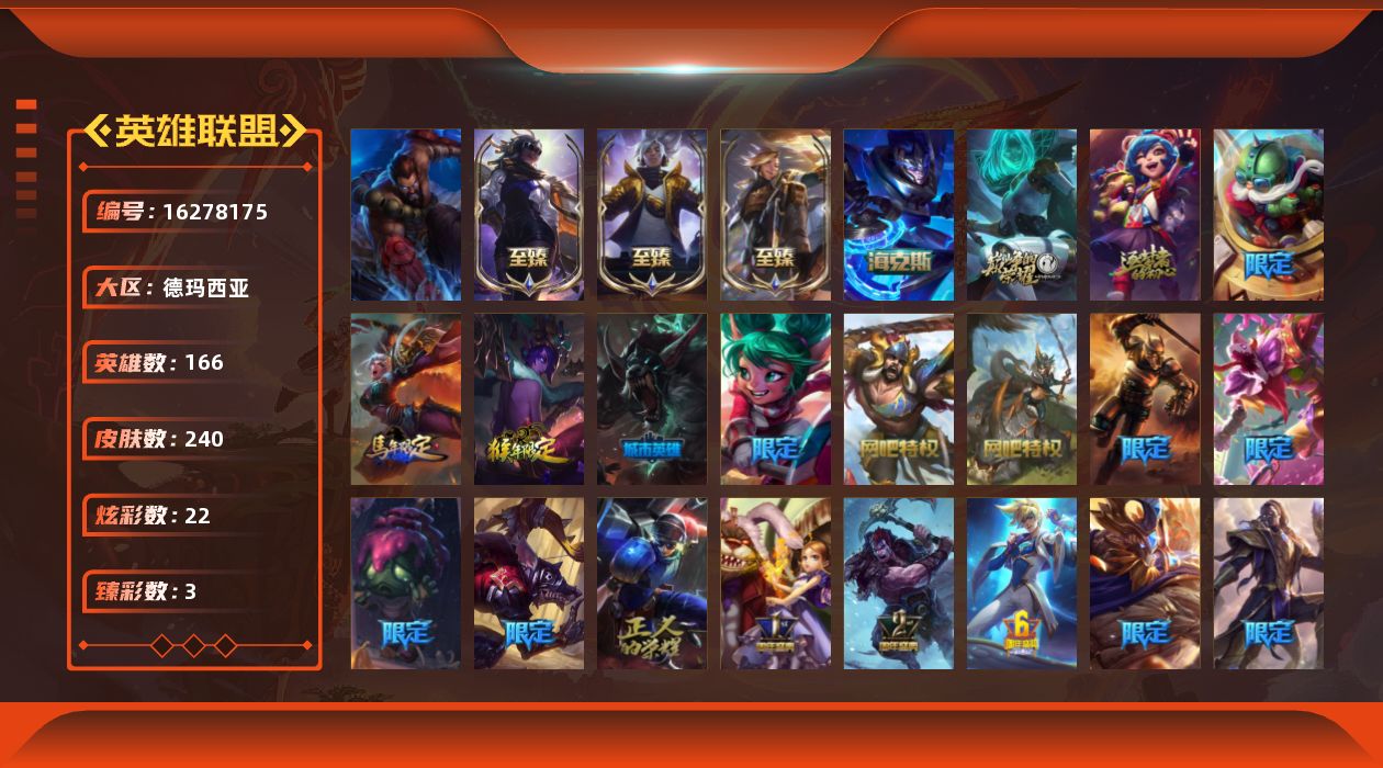 【405260】[16278175]可二次【特价出售/店主推荐】未定级段位-166英雄-240皮肤-22炫彩-1终极-6神话-39限定-29传说-55史诗【至臻皮肤】:至臻灵能特工伊泽瑞尔,至臻真实伤害亚索,至臻真实伤害赛娜【臻彩皮肤】:无畏骑士瑟庄妮赤子初心,神龙尊者圣龙李青龙腾云起,玉剑传说寒潭夭夭胭脂【年限皮肤】:替父从军花木兰,紫金罗刹莫甘娜【海克斯皮肤】:海克斯科技嘉文四世【冰雪限定】