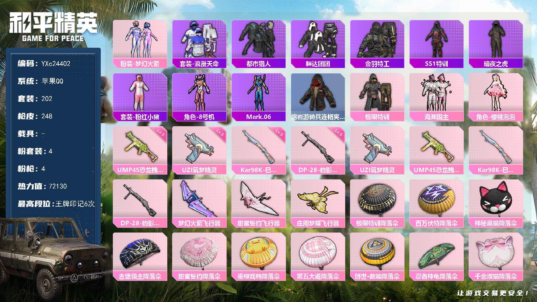【405764】【可二次】【苹果QQ】水银刺客 极限特训降落伞 漫步者 都市猎人 M249-古堡领主 机械英豪 极限特训 极速红龙 UMP45-恐龙拽拽 甜蜜誓约飞行器 庄周梦蝶飞行器 机械征服者 第五大道降落伞 M416-仓鼠灰灰 瑞龙福将 神奈川冲浪里 甜蜜誓约降落伞 浪漫天命 梦幻火箭飞行器 AWM-黄金龙骨 迅捷之星 胖达团团 纯白誓言 团圆交子 软萌银虎 垂柳戏鸭降落伞 SS1特训 迅