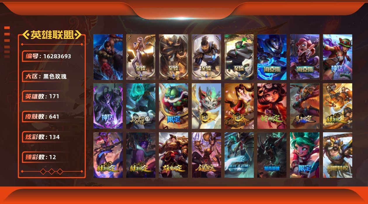 【405773】[16283693]可二次【特价出售/店主推荐】未定级段位-171英雄-641皮肤-134炫彩-1终极-10神话-92限定-58传说-158史诗【热门头像】:觅心游侠卢锡安头像,春晖神女头像【至臻皮肤】:至臻征服者贾克斯,至臻王国机神玄武盖伦,至臻KDA卡莎,至臻未来战士卢锡安【臻彩皮肤】:天龙之子卡莎飞龙乘云,无畏骑士瑟庄妮赤子初心,墨之影武者亚索金墨耀影,冠军典狱长锤石凯旋圣