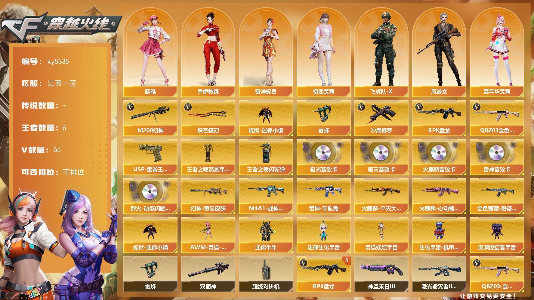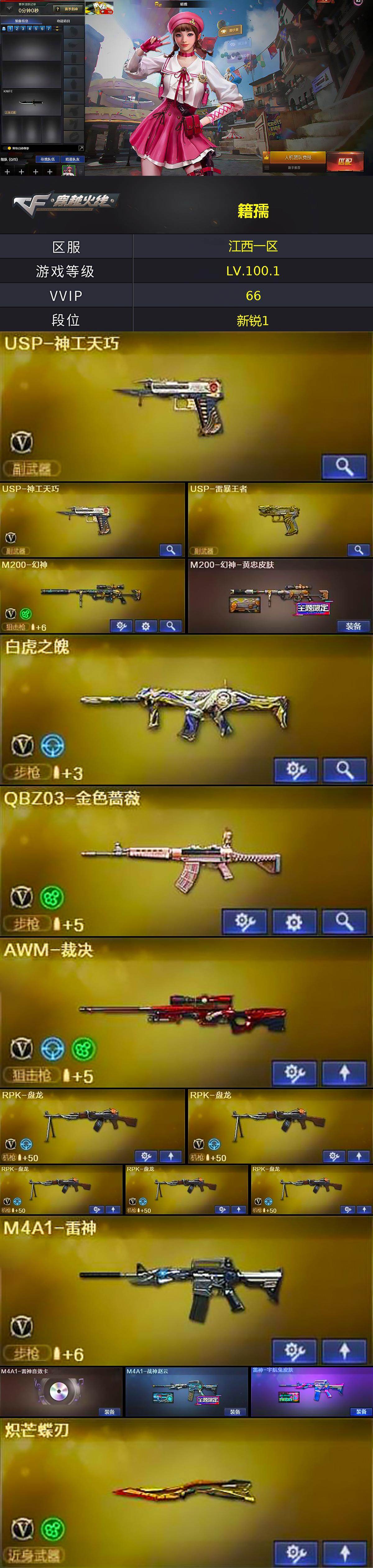 【405777】【405777】江西一区-66V-6王者武器数-0炫金武器数【热门武器】:QBZ03-金色蔷薇,M200-幻神,炼狱-迷你小钢,毒蜂,RPK-