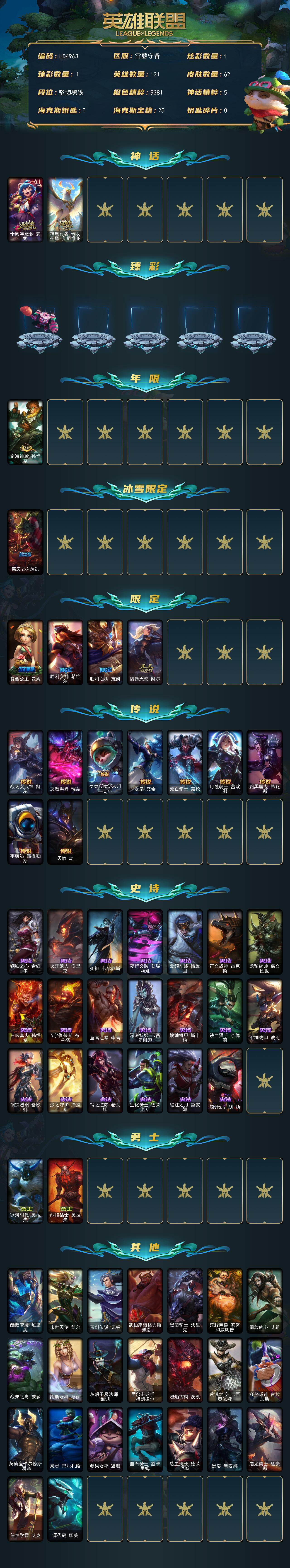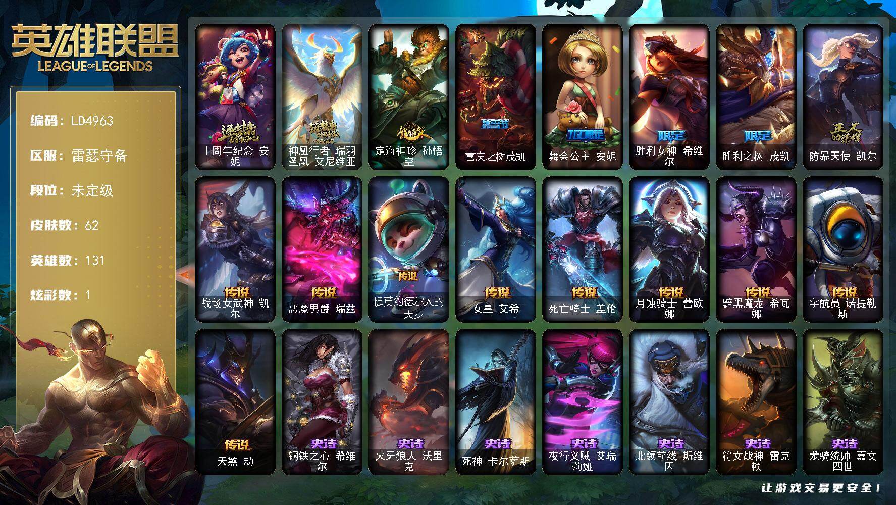 【406424】【LD4963】131英雄/62皮肤/2神话/6限定/1臻彩/1炫彩/9传说/20史诗/未定级/十周年纪念安妮/神凰行者瑞羽凤凰艾尼维亚/可爱可爱粉红红布里茨/定海神针孙悟空/喜庆之树茂凯/舞会公主安妮/胜利女神希维尔/胜利之树茂凯/防暴天使凯尔/战场女武神凯尔/恶魔男爵瑞兹/提莫“约德尔人的一大步”/女皇艾希/死亡骑士盖伦/月蚀骑士蕾欧娜/黯黑魔龙希瓦娜/宇航员诺提勒斯/天煞劫