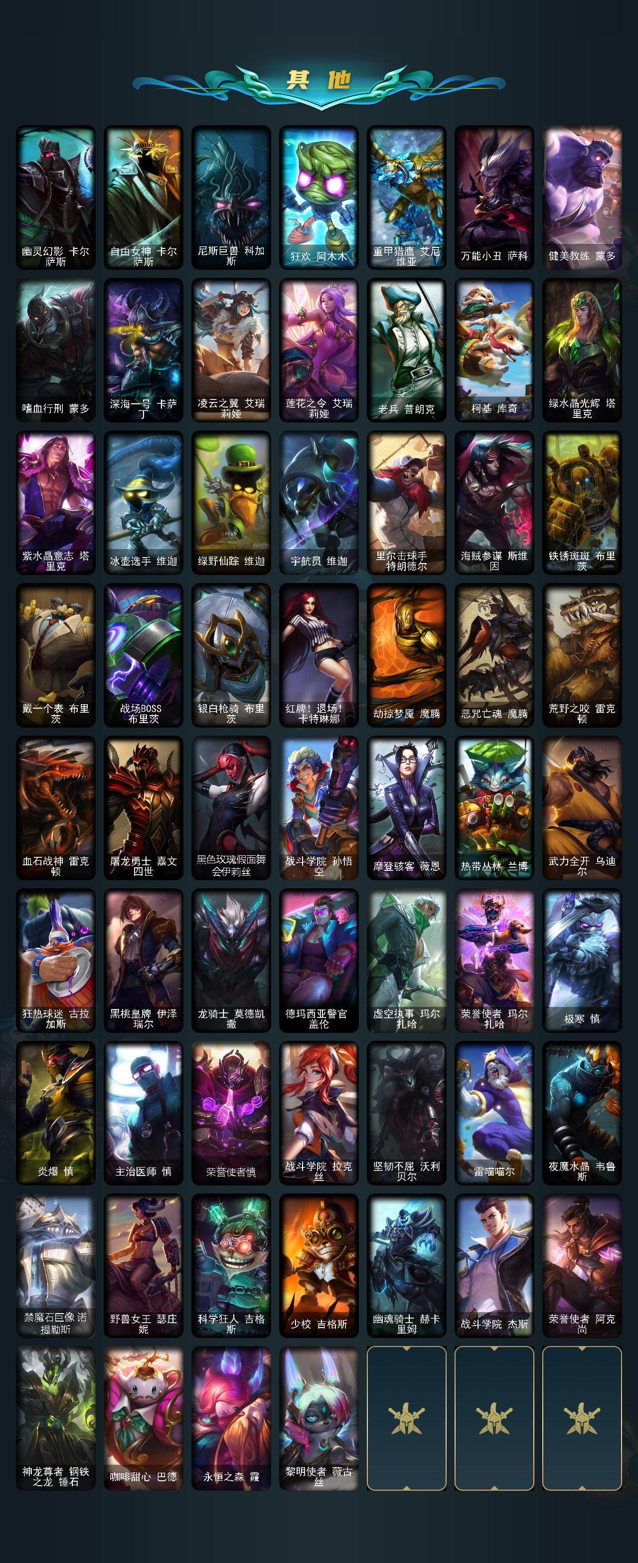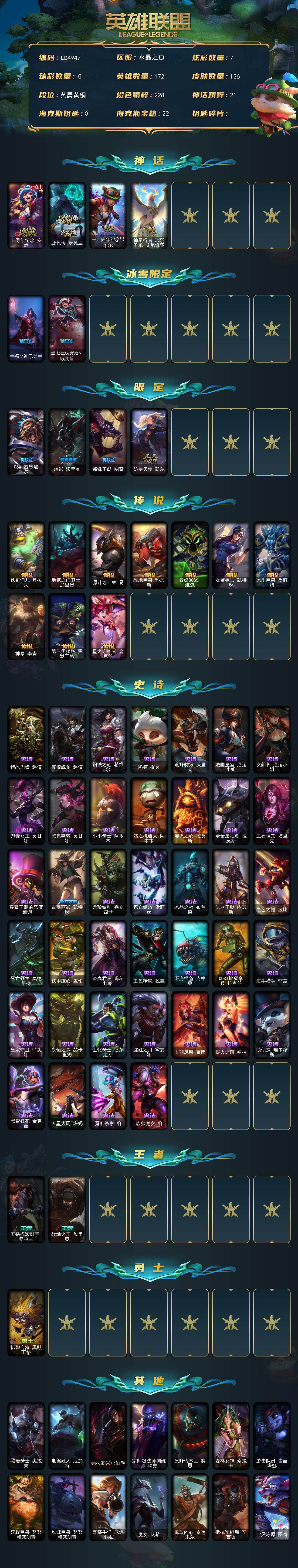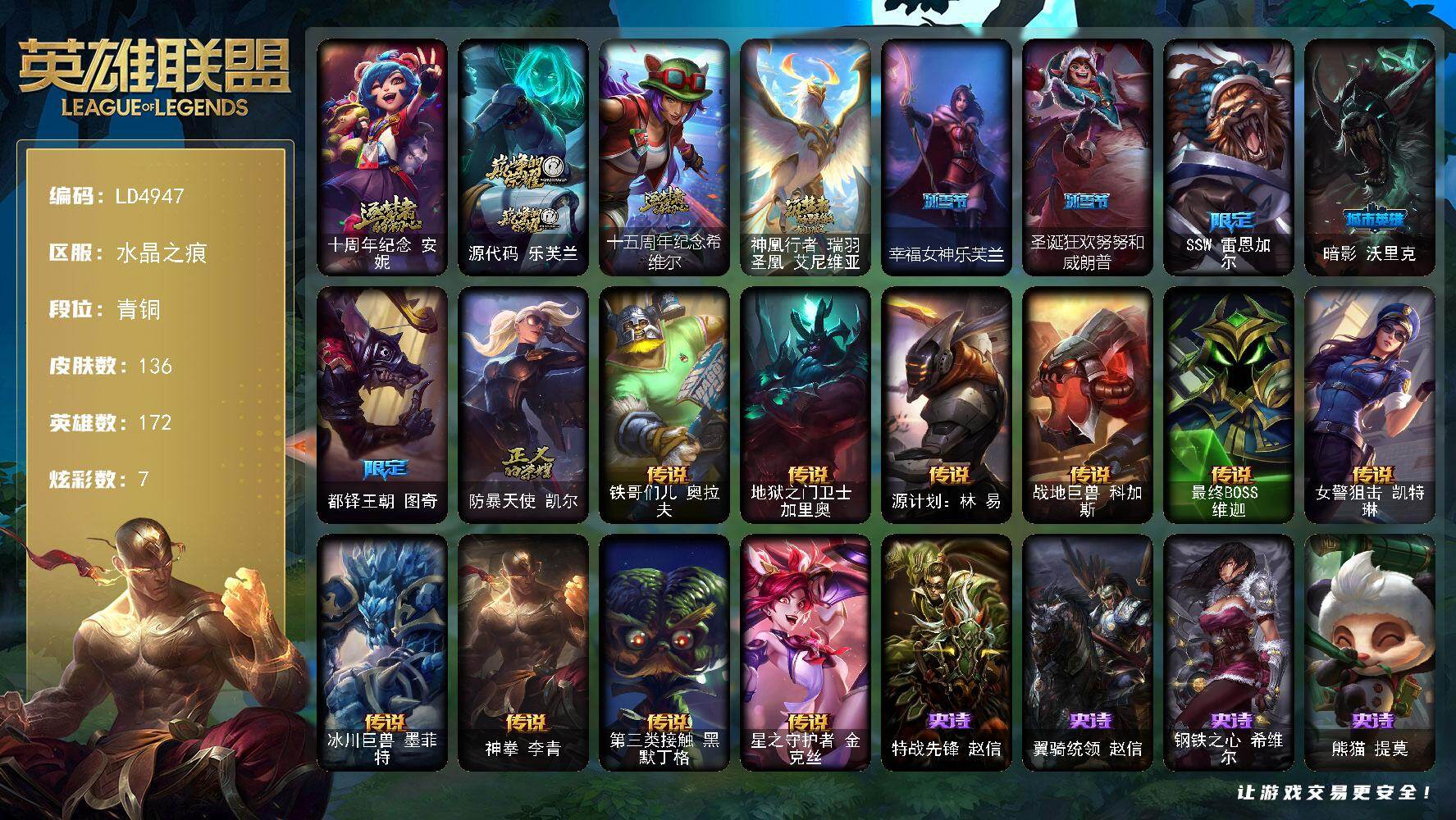 【406489】【LD4947】172英雄/136皮肤/4神话/6限定/7炫彩/10传说/39史诗/青铜/十周年纪念安妮/源代码乐芙兰/十五周年纪念希维尔/神凰行者瑞羽凤凰艾尼维亚/幸福女神乐芙兰/圣诞狂欢努努和威朗普/SSW雷恩加尔/暗影妖狐阿狸/都铎王朝图奇/防暴天使凯尔/铁哥们儿奥拉夫/地狱之门卫士加里奥/源计划:林易/战地巨兽科加斯/最终BOSS维迦/女警狙击凯特琳/冰川巨兽墨菲特/神拳