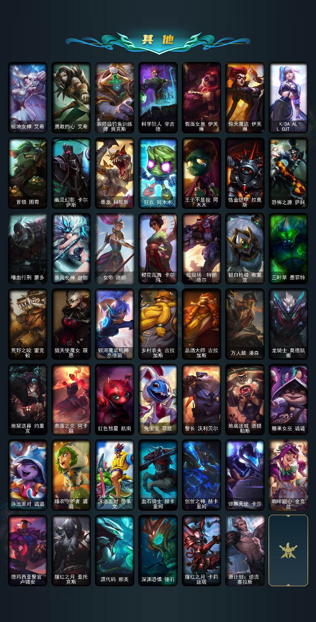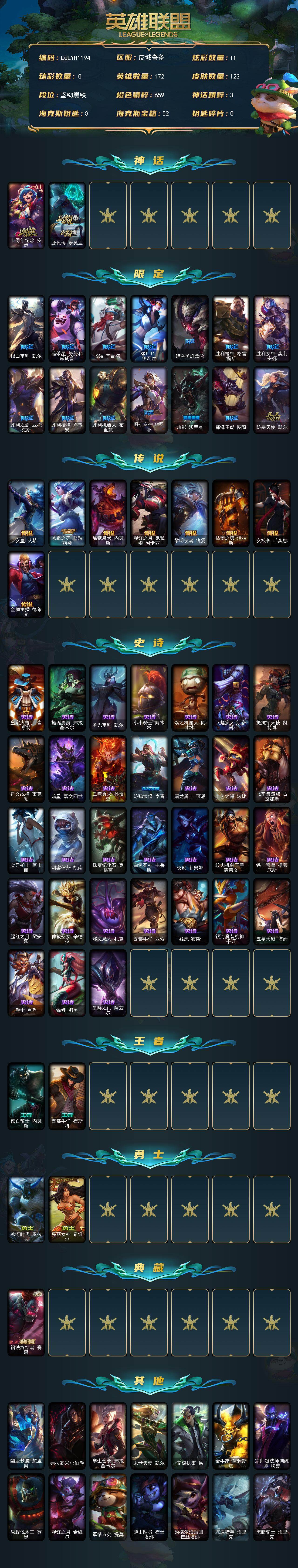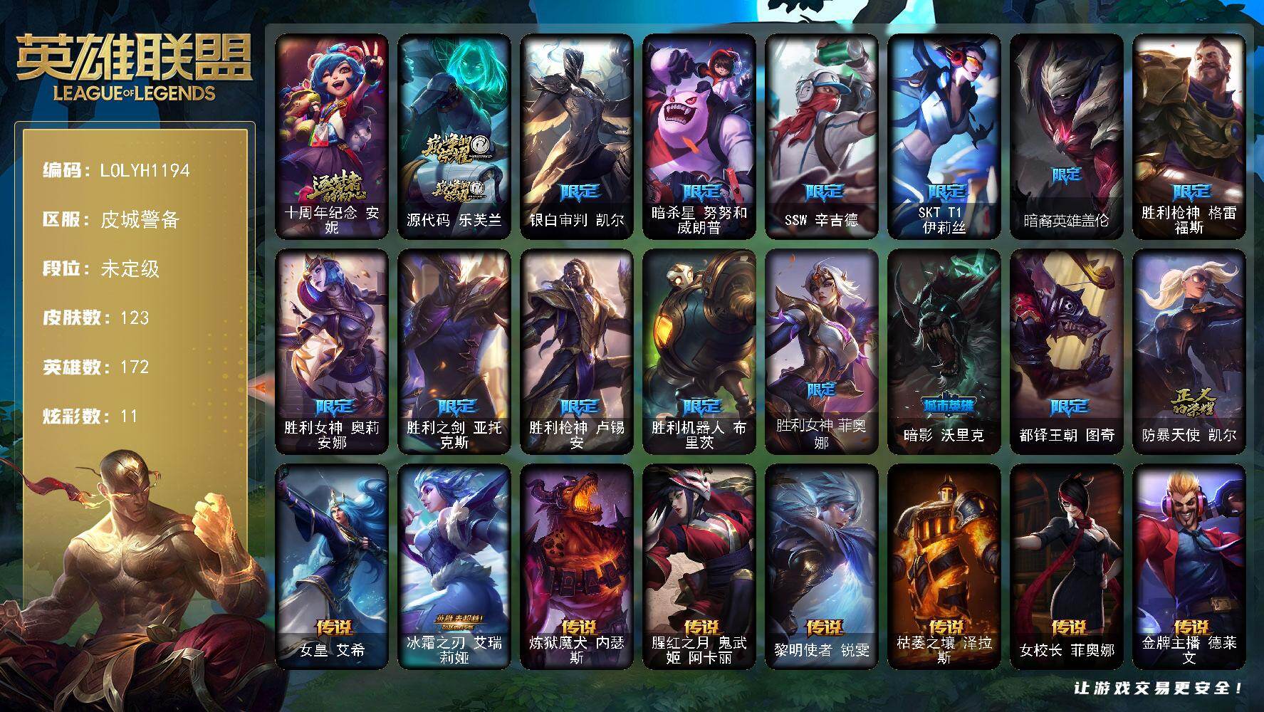 【409976】【LOLYH1194】172英雄/123皮肤/2神话/15限定/11炫彩/8传说/31史诗/未定级/十周年纪念安妮/源代码乐芙兰/银白审判凯尔/暗杀星努努和威朗普/SSW辛吉德/SKTT1伊莉丝/暗裔英雄盖伦/胜利枪神格雷福斯/胜利女神奥莉安娜/胜利之剑亚托克斯/胜利枪神卢锡安/胜利机器人布里茨/胜利女神菲奥娜/暗影妖狐阿狸/都铎王朝图奇/防暴天使凯尔/女皇艾希/冰霜之刃艾瑞莉娅
