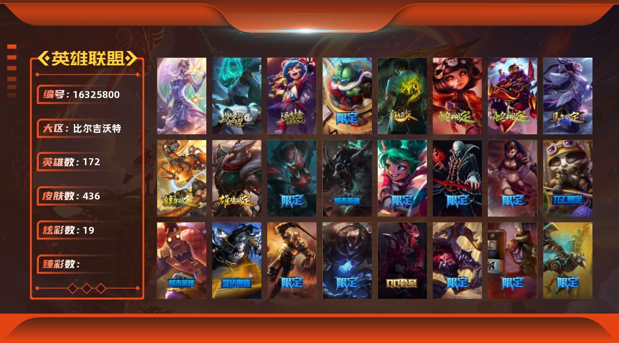 【411609】[16325800]【特价出售/店主推荐】青铜段位-172英雄-436皮肤-19炫彩-1终极-2神话-64限定-26传说-123史诗【珍稀头像】:红包头像,雪花头像【热门头像】:卡特琳娜的匕首头像【年限皮肤】:龙的传人李青,你看见过我的熊猫吗安妮,神龙之翼库奇,广寒仙子嫦娥,美猴王孙悟空,司马懿仲达【冰雪限定】:幸福女神乐芙兰,圣诞开心鬼提莫,圣诞精灵崔丝塔娜,圣诞狂欢努努和威朗