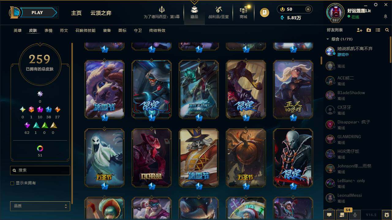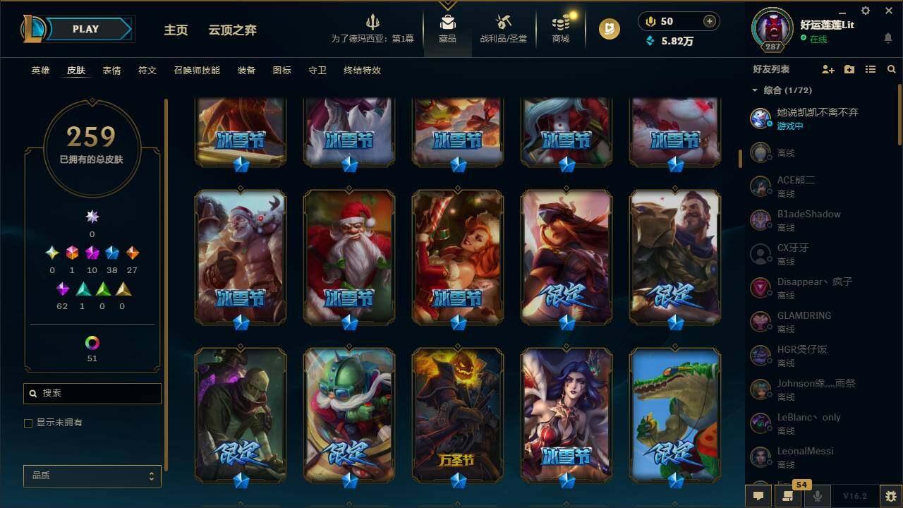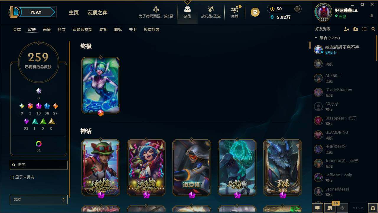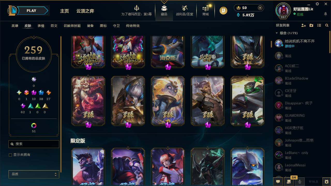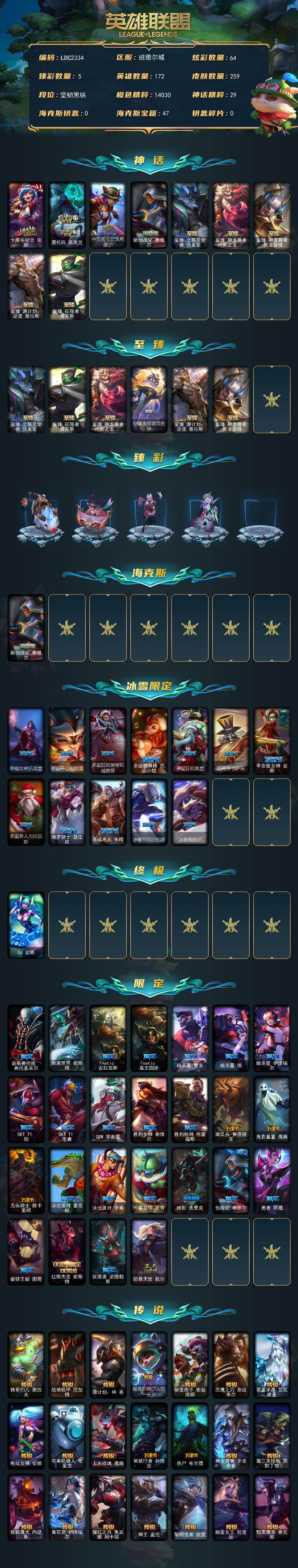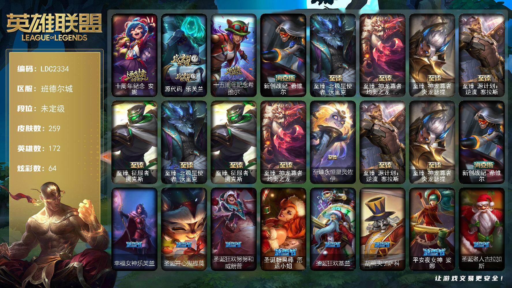 【411735】【LDC2334】172英雄/259皮肤/1终极/10神话/38限定/5臻彩/64炫彩/27传说/62史诗/未定级/十周年纪念安妮/源代码乐芙兰/十五周年纪念希维尔/新创战纪希维尔/至臻征服者贾克斯/至臻北极星使者沃里克/至臻神龙尊者均衡之龙沃利贝尔/至臻神龙尊者炎龙瑟提/至臻源计划:逆流塞拉斯/至臻永恒星灵佐伊/无畏骑士瑟庄妮赤子初心/玉剑传说琴仙子丁香/星之守护者卡莎热情之光