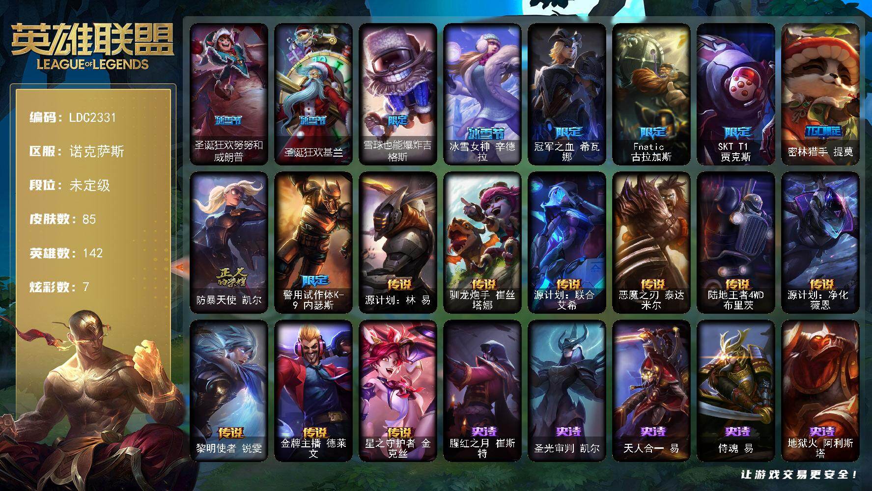 【411750】【LDC2331】142英雄/85皮肤/10限定/1臻彩/7炫彩/9传说/28史诗/未定级/红莲之刃锐雯/圣诞狂欢努努和威朗普/圣诞狂欢基兰/雪球也能爆炸吉格斯/冰雪女神辛德拉/冠军之血希瓦娜/Fnatic古拉加斯/SKTT1贾克斯/密林猎手提莫/防暴天使凯尔/警用试作体K-9内瑟斯/源计划:林易/驯龙炮手崔丝塔娜/源计划:联合艾希/恶魔之刃泰达米尔/陆地王者4WD布里茨/源计划