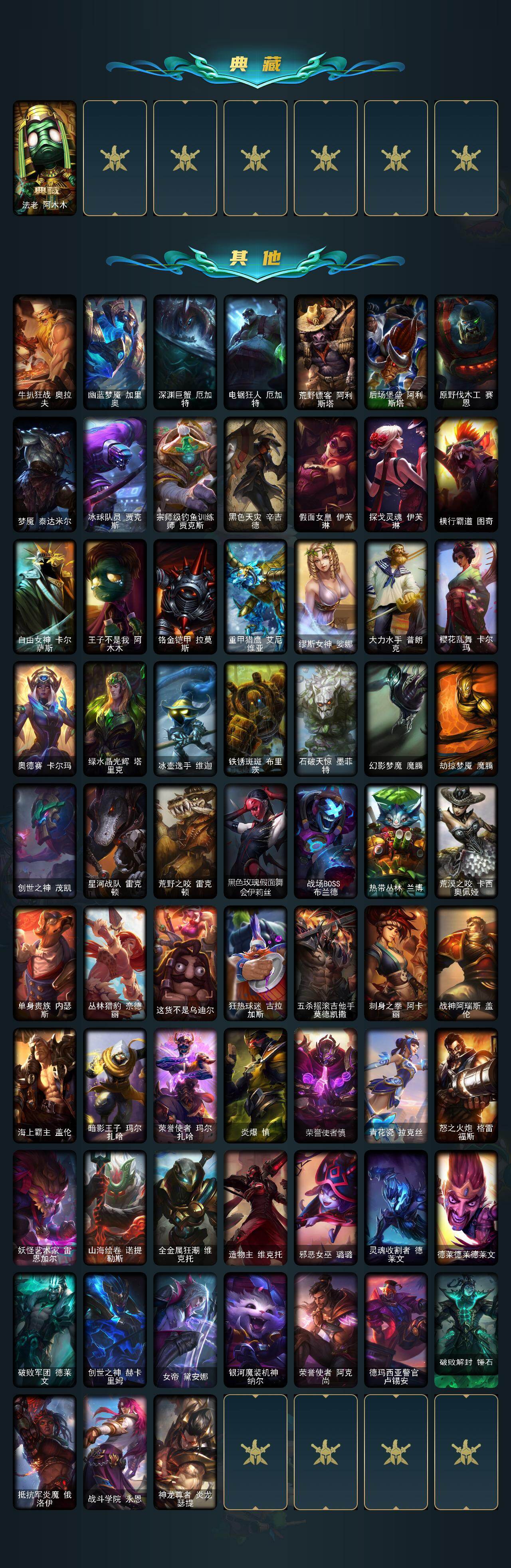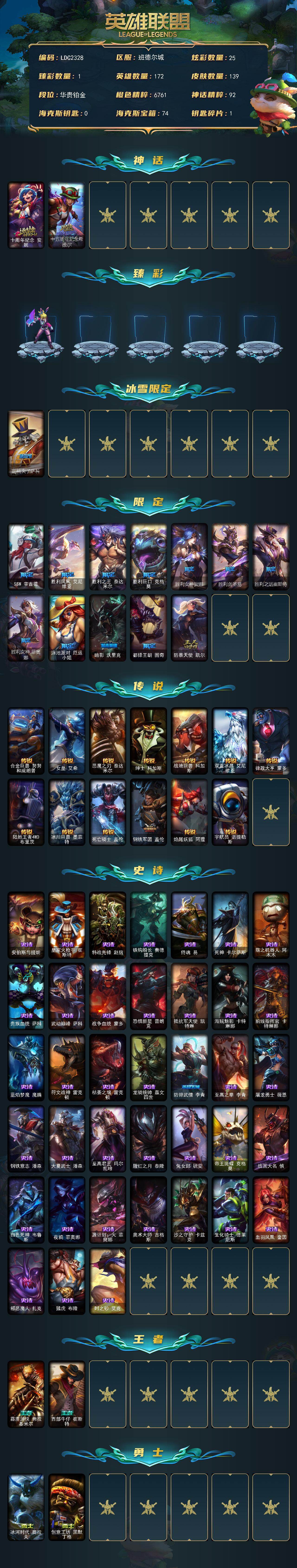 【411777】【LDC2328】172英雄/139皮肤/2神话/14限定/1臻彩/25炫彩/13传说/38史诗/铂金/十周年纪念安妮/十五周年纪念希维尔/幻灵战斗兔锐雯梦幻强袭/胡桃夹子萨科/SSW辛吉德/胜利凤凰艾尼维亚/胜利之王泰达米尔/胜利巨口克格莫/胜利女神娑娜/胜利剑圣易/胜利之运崔斯特/胜利女神菲奥娜/泳池派对厄运小姐/暗影妖狐阿狸/都铎王朝图奇/防暴天使凯尔/合金巨兽努努和威朗普