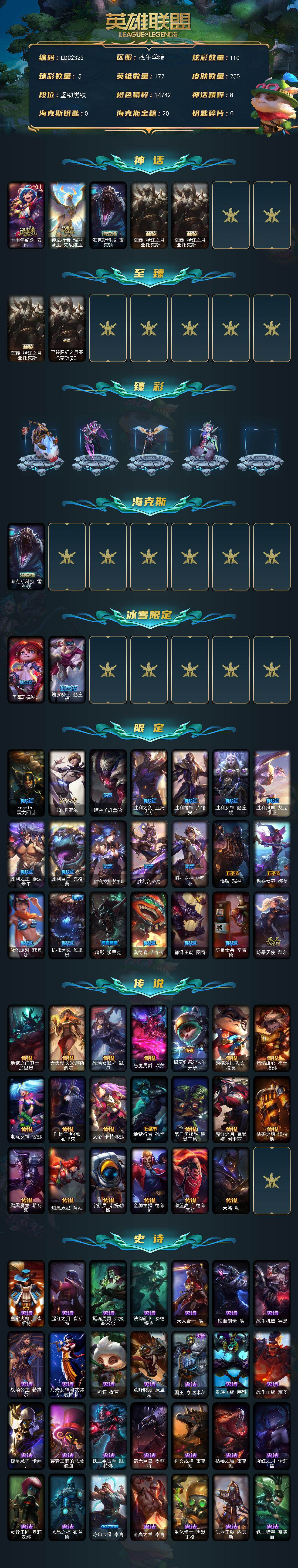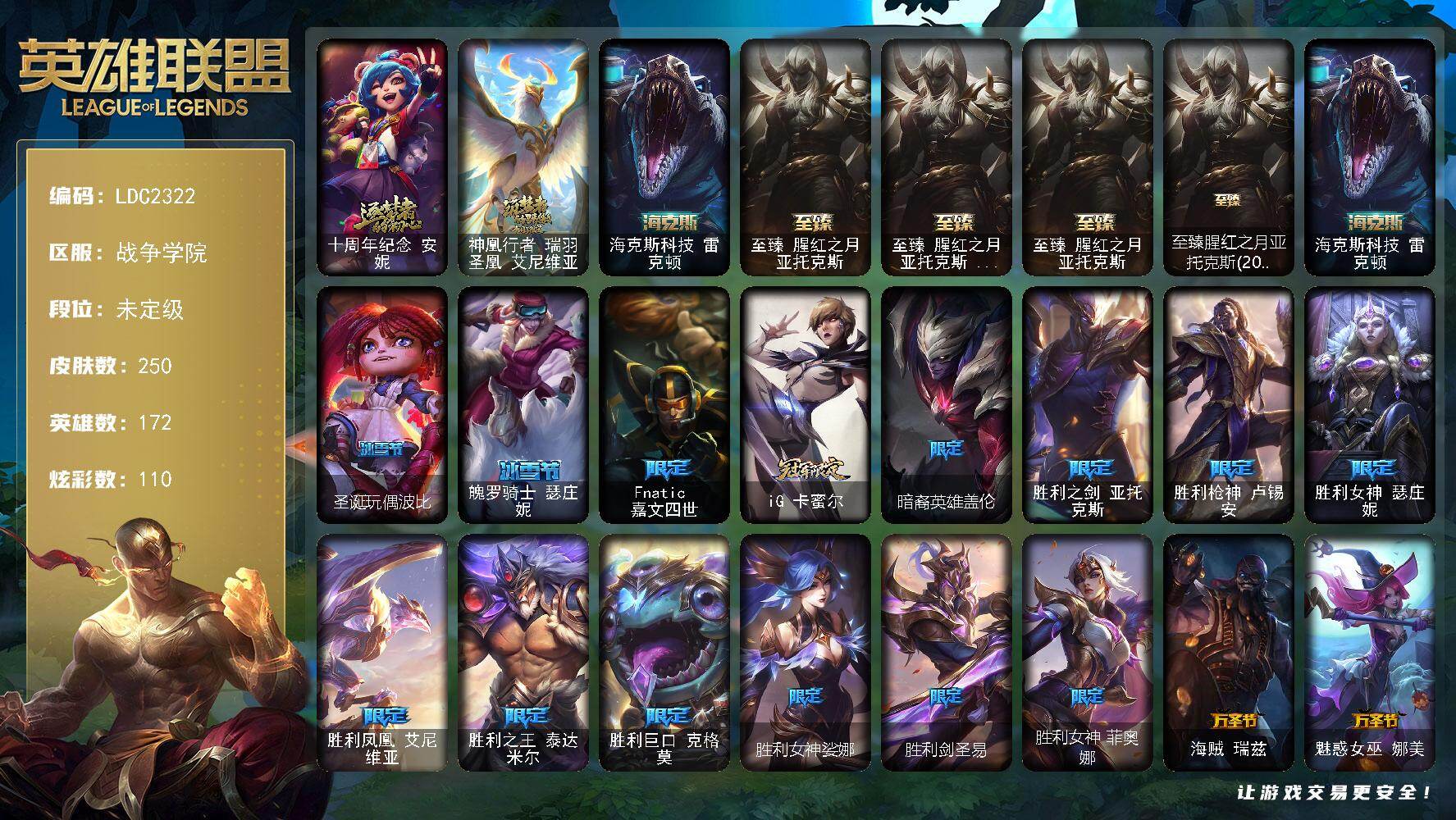 【411818】【LDC2322】172英雄/250皮肤/5神话/24限定/5臻彩/110炫彩/20传说/65史诗/未定级/十周年纪念安妮/神凰行者瑞羽凤凰艾尼维亚/海克斯科技雷克顿/至臻腥红之月亚托克斯/至臻腥红之月亚托克斯(2022)/至臻腥红之月亚托克斯(2022)/无畏骑士瑟庄妮赤子初心/天煞劫恒星游历者/玉剑传说翼剑仙珠光/魔女阿卡丽虚荣/净雪之月莫甘娜冬虹/圣诞玩偶波比/魄罗骑士瑟庄