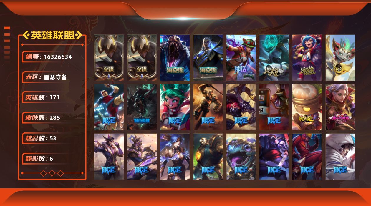 【411819】[16326534]可二次【店主推荐捡漏号!可直接换绑】铂金段位-171英雄-285皮肤-53炫彩-0终极-8神话-29限定-24传说-62史诗【至臻皮肤】:至臻黑夜使者李青,至臻黑夜使者李青(2022)【臻彩皮肤】:无畏骑士瑟庄妮赤子初心,冰霜之刃艾瑞莉娅炫金,源计划毁灭派克幻灭,幻灵战斗猫金克丝梦幻强袭,破败军团厄运小姐灵岛征伐使,可爱可爱粉红红布里茨【年限皮肤】:天龙之子斯