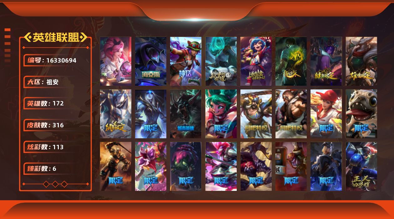 【412618】[16330694]铂金段位-172英雄-316皮肤-113炫彩-3终极-4神话-60限定-35传说-62史诗【臻彩皮肤】:神龙尊者圣龙李青登龙,西部魔影卢锡安贝利尔之怠,战斗学院卡特琳娜盛典礼服,星之守护者奥莉安娜未来之光,西部天使赛娜贝利尔之怠,星之吞噬者莫甘娜热情之末【年限皮肤】:龙的传人李青,紫金罗刹莫甘娜,司马懿仲达,王国机神苍狼瑟提,点心宝贝阿木木【海克斯皮肤】:海克