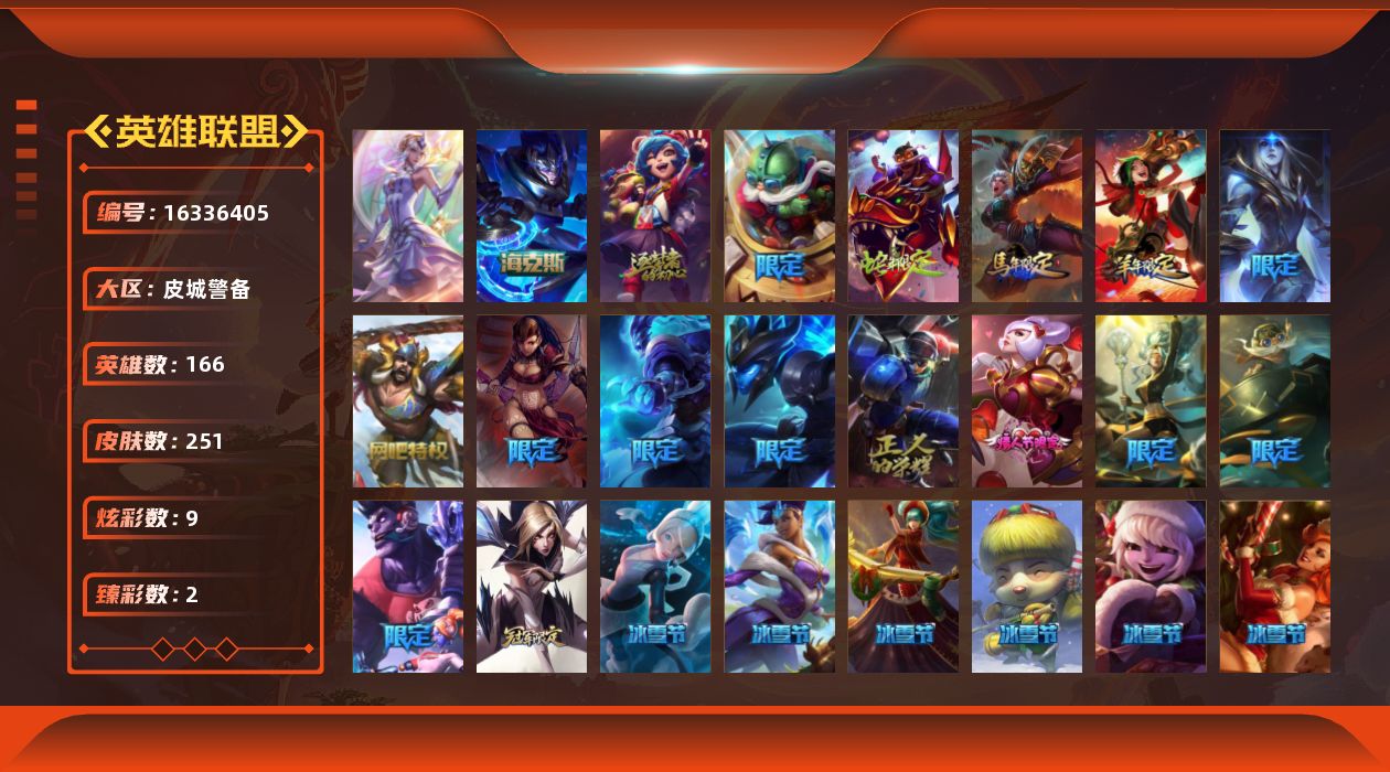 【413584】[16336405]【特价出售/店主推荐】未定级段位-166英雄-251皮肤-9炫彩-1终极-3神话-31限定-29传说-59史诗【臻彩皮肤】:无畏骑士瑟庄妮赤子初心,水晶玫瑰迦娜甜蜜花蕾【年限皮肤】:碧玉之牙卡西奥佩娅,神龙之翼库奇,替父从军花木兰,神龙烈焰金克丝【海克斯皮肤】:海克斯科技嘉文四世【情人节限定】:觅心魔灵奥莉安娜【冰雪限定】:圣诞开心鬼提莫,圣诞精灵崔丝塔娜,圣