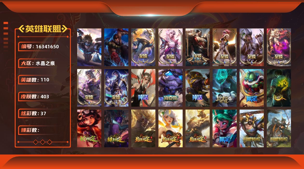 【414058】[16341650]IG全套签名版冠军皮肤2终极 2神话 63限定 28传说 105史诗 403皮肤 37炫彩 110英雄 可二次 可修改实名 【至臻】:至臻 永恒星灵 佐伊,至臻 心之钢 永恩,至臻 花仙使者 卡特琳娜,至臻 灵魂莲华 拉克丝,至臻 凯旋将军 德莱厄斯,至臻 K/DA 阿卡丽,至臻 魅惑女巫 厄运小姐,至臻 神龙尊者均衡之龙 沃利贝尔,殿堂传奇 乐芙兰【海克斯】