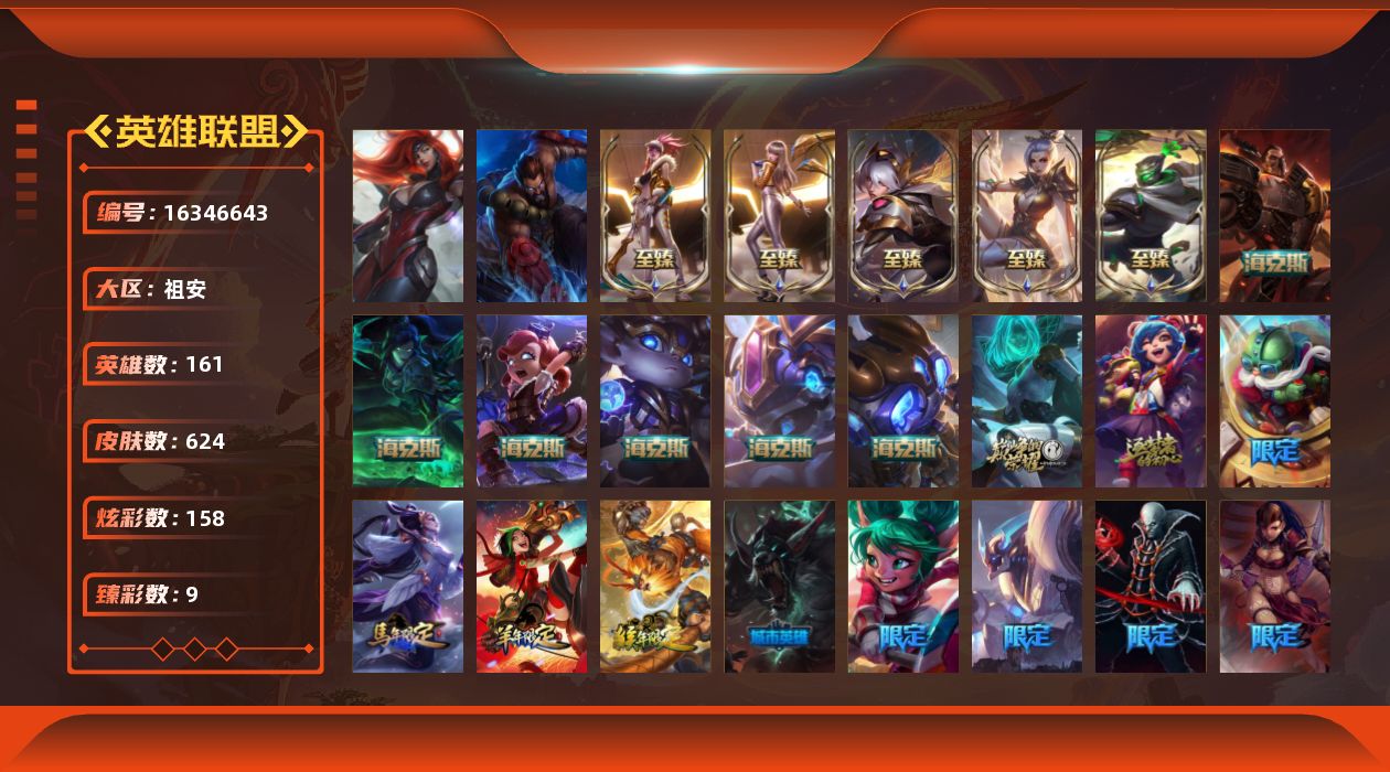 【415147】[16346643]【店主推荐捡漏号】未定级段位-161英雄-624皮肤-158炫彩-2终极-14神话-113限定-63传说-160史诗【热门头像】:银河魔装机神安妮头像,玉剑传说舞剑仙头像,源计划刀妹头像【至臻皮肤】:至臻征服者贾克斯,至臻源计划正义艾瑞莉娅,至臻KDA阿卡丽,至臻玉剑传说武剑仙锐雯,至臻KDA卡莎【臻彩皮肤】:神龙烈焰金克丝珍珠龙息,无畏骑士瑟庄妮赤子初心,冰