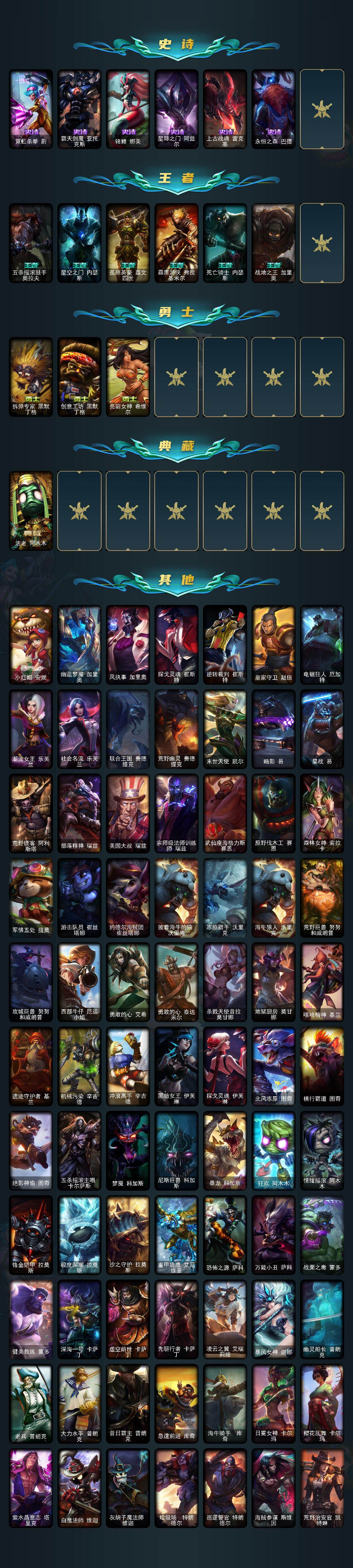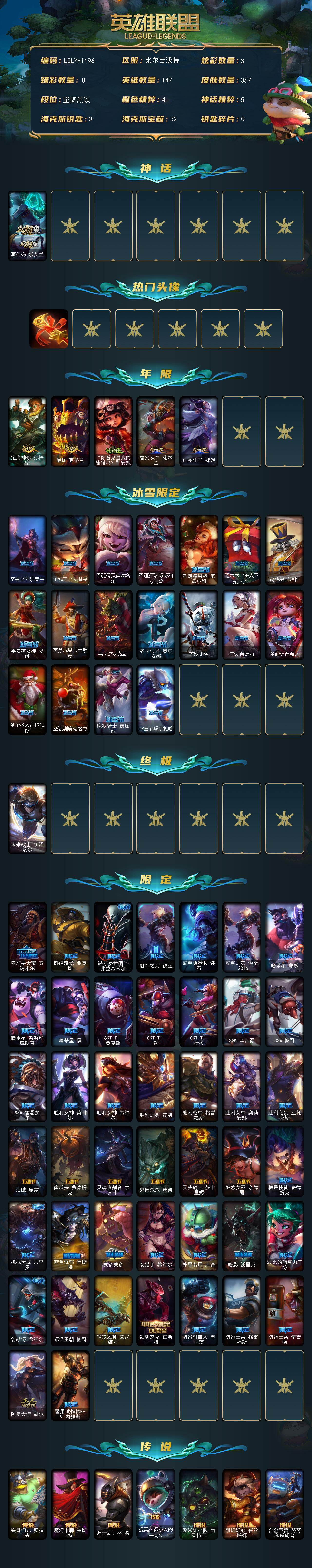 【415484】【LOLYH1196】147英雄/357皮肤/1终极/1神话/67限定/3炫彩/19传说/97史诗/未定级/源代码乐芙兰/卡特琳娜的匕首/定海神针孙悟空/醒狮克格莫/“你看见过我的熊猫吗?”安妮/替父从军花木兰/广寒仙子嫦娥/幸福女神乐芙兰/圣诞开心鬼提莫/圣诞精灵崔丝塔娜/圣诞狂欢努努和威朗普/圣诞糖果棒厄运小姐/阿木木:“主人不要我了”/胡桃夹子萨科/平安夜女神娑娜/英勇玩具