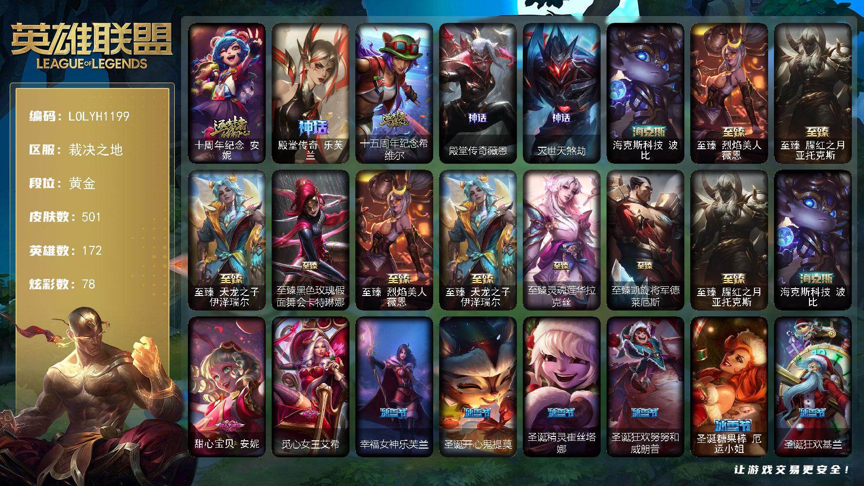 【415598】【LOLYH1199】172英雄/501皮肤/2终极/12神话/68限定/4臻彩/78炫彩/42传说/122史诗/黄金账号等级:1020/十周年纪念安妮/殿堂传奇乐芙兰/十五周年纪念希维尔/殿堂传奇薇恩/灭世天煞劫/海克斯科技波比/至臻天龙之子伊泽瑞尔/至臻烈焰美人薇恩/至臻腥红之月亚托克斯/红包/至臻黑色玫瑰假面舞会卡特琳娜/至臻灵魂莲华拉克丝/至臻凯旋将军德莱厄斯/无畏骑士瑟