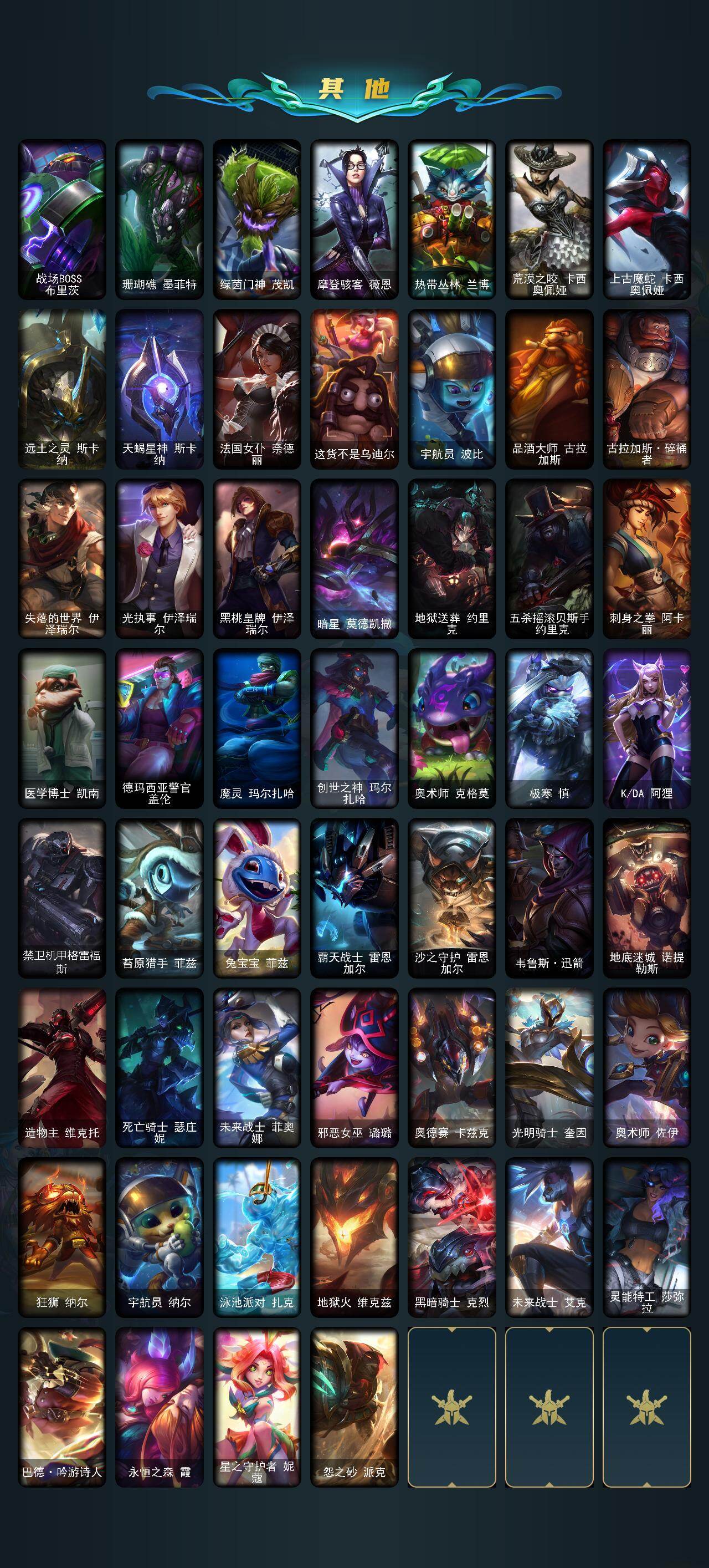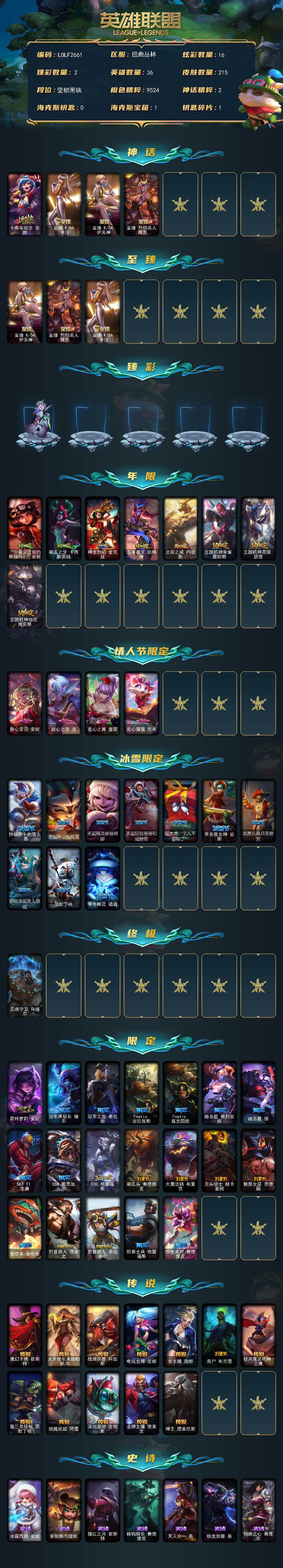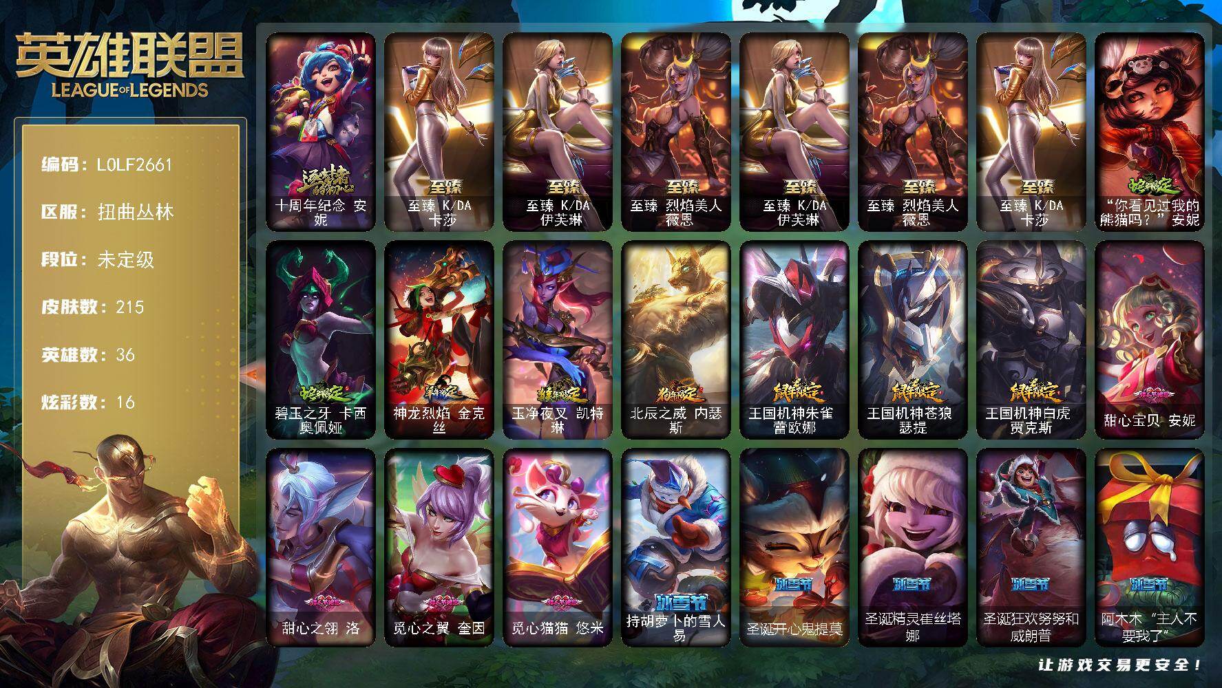 【418139】【LOLF2661】36英雄/215皮肤/1终极/4神话/41限定/2臻彩/16炫彩/12传说/56史诗/未定级/十周年纪念安妮/至臻K/DA卡莎/至臻K/DA伊芙琳/至臻烈焰美人薇恩/魔女阿卡丽虚荣/净雪之月莫甘娜冬虹/“你看见过我的熊猫吗?”安妮/碧玉之牙卡西奥佩娅/神龙烈焰金克丝/玉净夜叉凯特琳/北辰之威内瑟斯/王国机神朱雀蕾欧娜/王国机神苍狼瑟提/王国机神白虎贾克斯/甜心