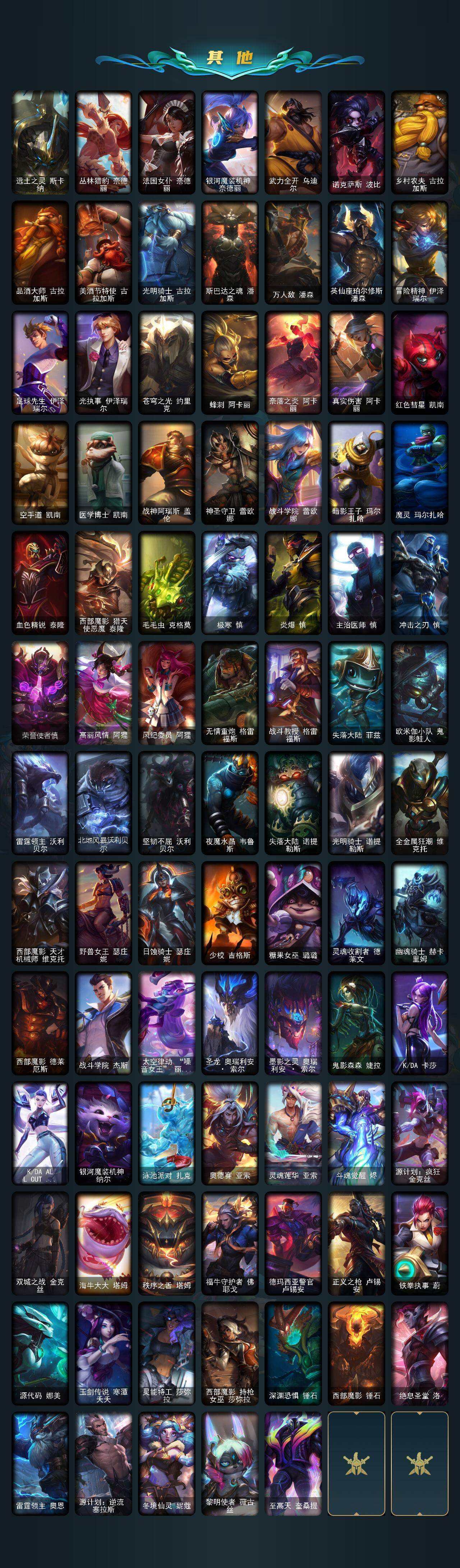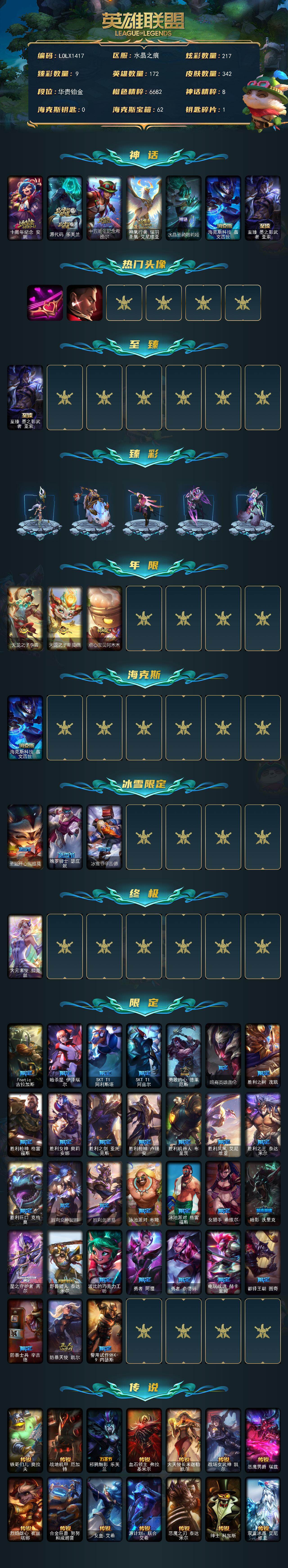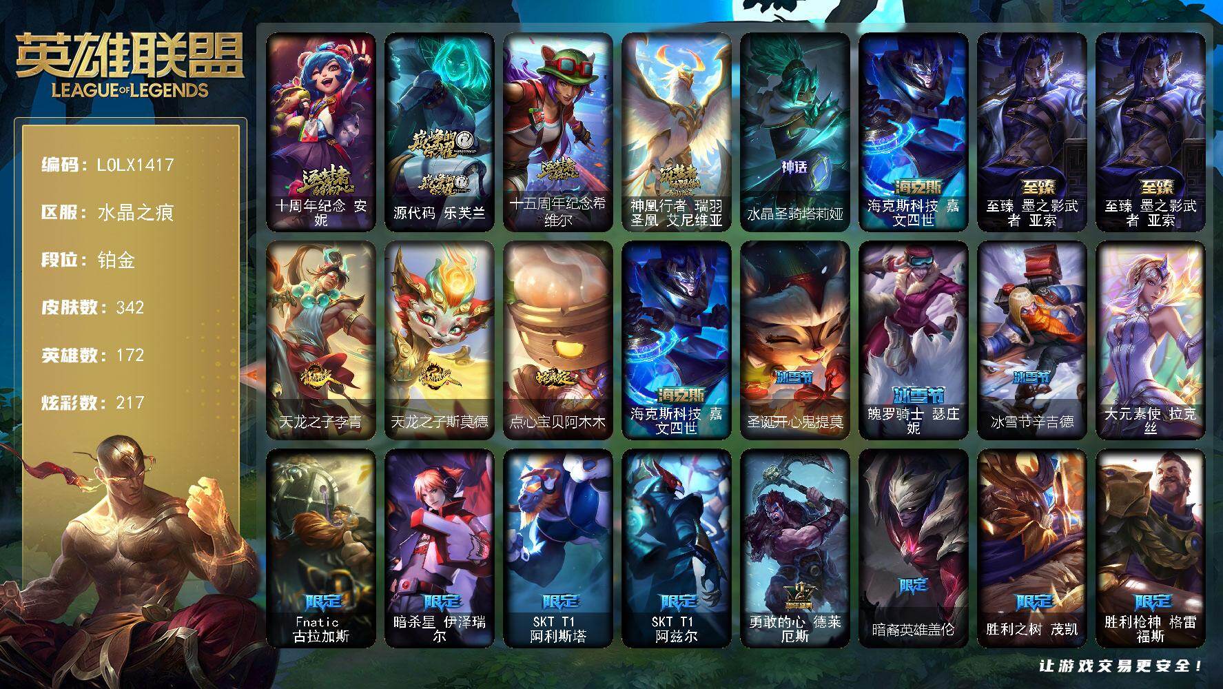 【418176】【LOLX1417】172英雄/342皮肤/1终极/7神话/39限定/9臻彩/217炫彩/34传说/62史诗/铂金/十周年纪念安妮/源代码乐芙兰/十五周年纪念希维尔/神凰行者瑞羽凤凰艾尼维亚/水晶圣骑塔莉娅/海克斯科技嘉文四世/至臻墨之影武者亚索/爱情之歌/觅心游侠卢锡安/天龙之子迦娜云起龙骧/天龙之子卡莎飞龙乘云/无畏骑士瑟庄妮赤子初心/玉剑传说无影竞星/天煞劫恒星游历者/灵魂