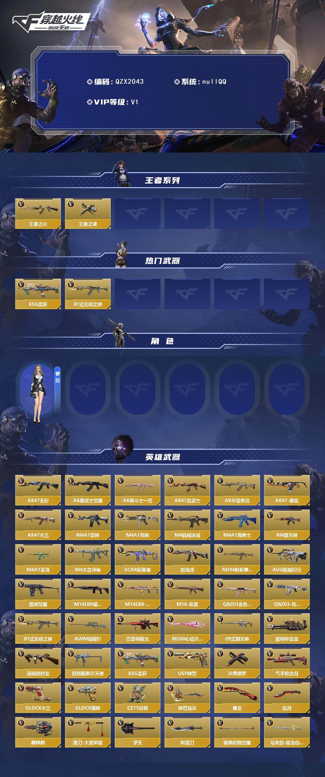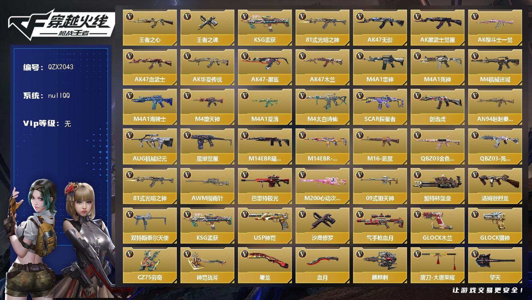 【419487】【QZX2043】VIP1/98V/王者之心/王者之魂/KSG-孟获/81式-光明之神/萝拉/无影/AK47-黑武士觉醒/AK47-樱斗士-一觉/AK47-血武士/AK47-华夏传说/AK47-黑鲨/AK47-木兰/雷神/M4A1-死神/M4A1-机械迷城/M4A1-海骑士/M4A1-堕天神/M4A1-夏清/M4A1-太白诗仙/SCAR-探星者/剑齿虎/AN94-赳赳秦师/AUG
