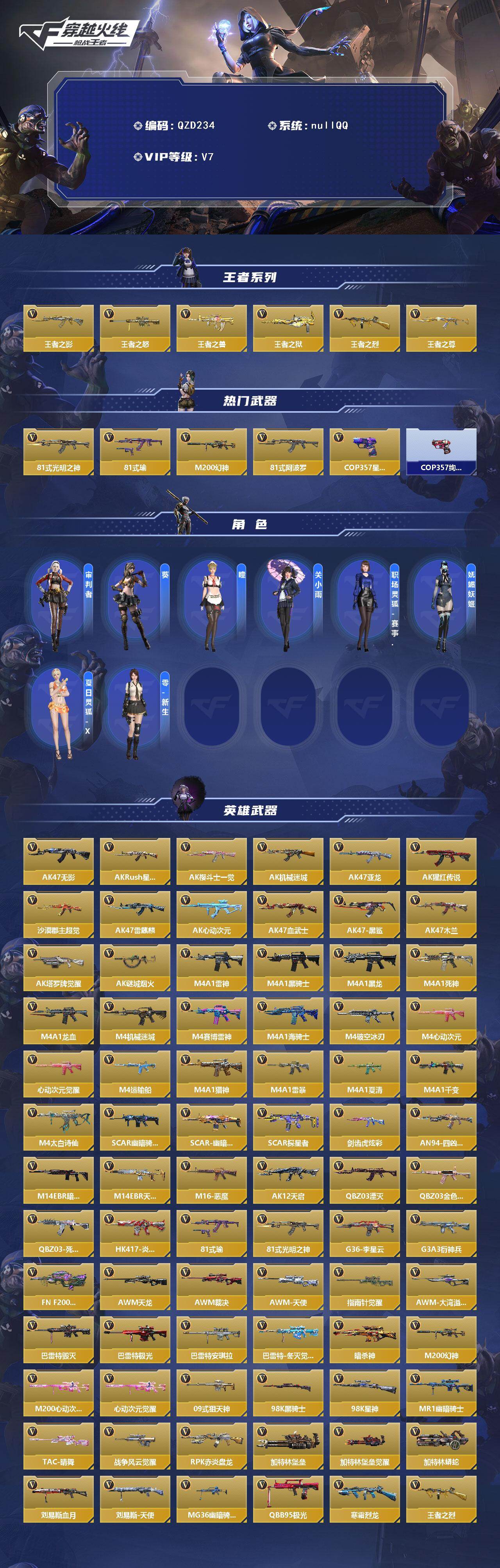 【419752】【QZD234】VIP7/281V/王者之影/王者之怒/王者之兽/王者之狱/王者之烈/王者之尊/81式-光明之神/81式-瑜/幻神/81式-阿波罗/星象cop/COP 357-绚樱/审判者/葵/瞳/关小雨/职场灵狐-赛事经理/妩媚妖姬/夏日灵狐-X/零-新生/无影/AK47-Rush-星速/AK47-樱斗士-一觉/AK47-机械迷城/AK47-亚龙/AK47-猩红传说/AK47-