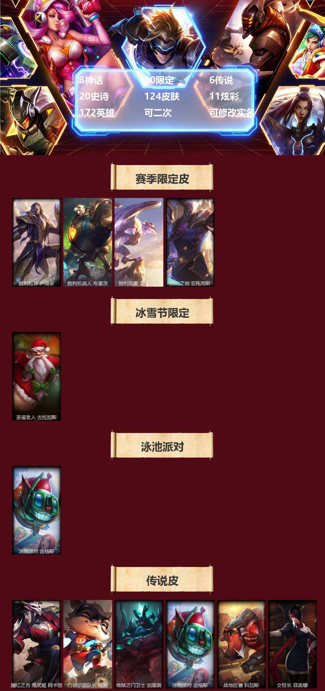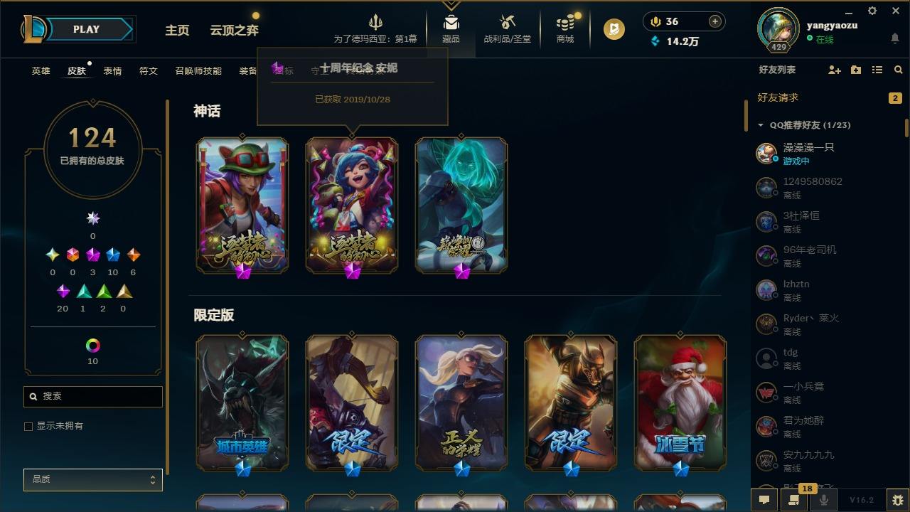【419969】[16384334]3神话 10限定 6传说 20史诗 124皮肤 11炫彩 172英雄 可二次 可修改实名 【赛季限定皮】胜利凤凰 艾尼维亚,胜利之剑 亚托克斯,胜利枪神 卢锡安,胜利机器人 布里茨【冰雪节限定】圣诞老人 古拉加斯【泳池派对】泳池派对 吉格斯【周年】10周年 安妮【其他限定/神话皮】十五周年纪念 希维尔,源代码 乐芙兰,防暴天使 凯尔,暗影 沃里克,都铎王朝 图