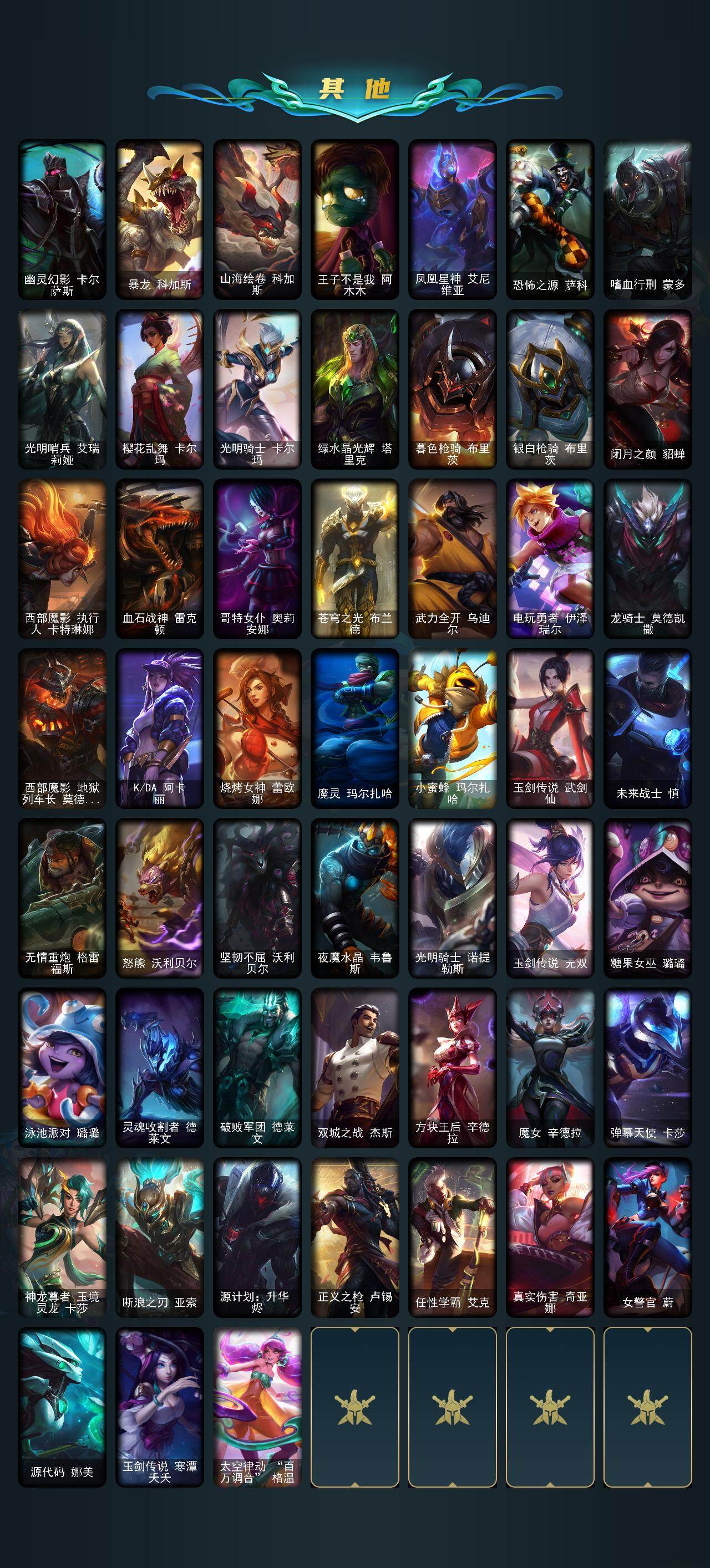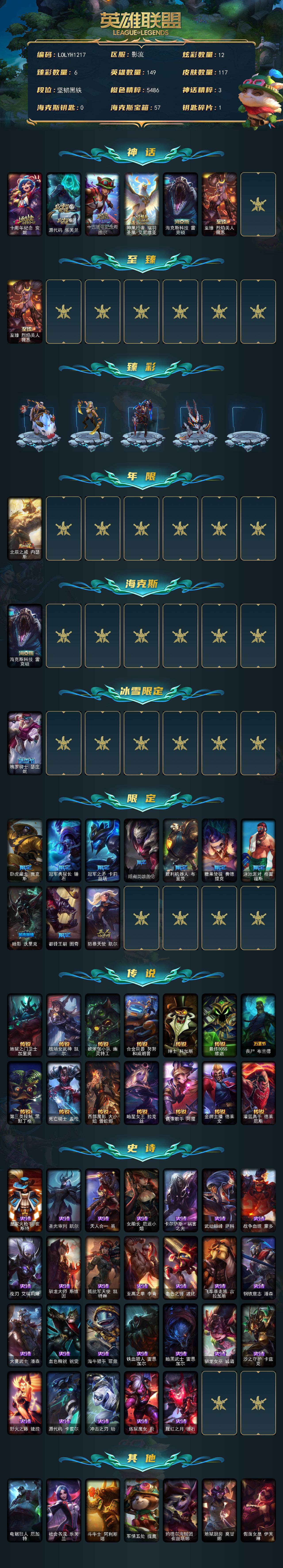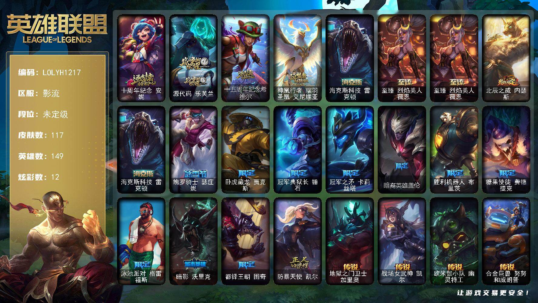【421019】【LOLYH1217】149英雄/117皮肤/6神话/12限定/6臻彩/12炫彩/14传说/26史诗/未定级/十周年纪念安妮/源代码乐芙兰/十五周年纪念希维尔/神凰行者瑞羽凤凰艾尼维亚/海克斯科技雷克顿/至臻烈焰美人薇恩/无畏骑士瑟庄妮赤子初心/闭月之颜貂蝉炫金莲华/玉剑传说无劫胭脂/霸天异形卡兹克刹那银光/魔女阿卡丽虚荣/红莲之刃锐雯/北辰之威内瑟斯/魄罗骑士瑟庄妮/卧虎藏龙贾