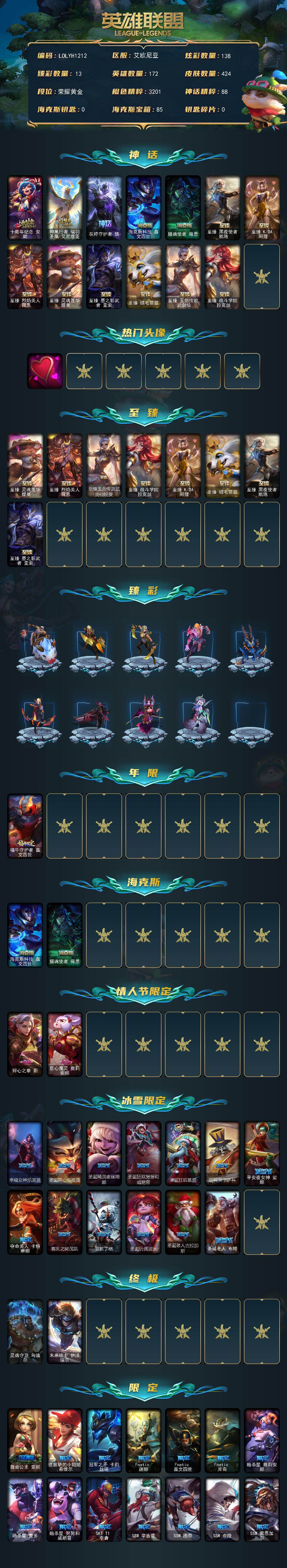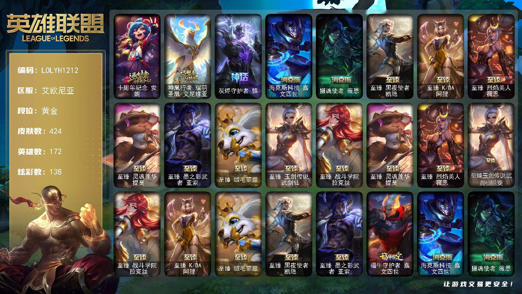 【421022】【LOLYH1212】172英雄/424皮肤/2终极/13神话/63限定/13臻彩/138炫彩/48传说/88史诗/黄金/十周年纪念安妮/神凰行者瑞羽凤凰艾尼维亚/灰烬守护者慎/海克斯科技嘉文四世/摄魂使者薇恩/至臻黑夜使者凯隐/至臻K/DA阿狸/至臻烈焰美人薇恩/至臻灵魂莲华提莫/至臻墨之影武者亚索/至臻绒毛菲兹/至臻玉剑传说武剑仙/至臻战斗学院拉克丝/爱意绵绵/天龙之子卡莎飞