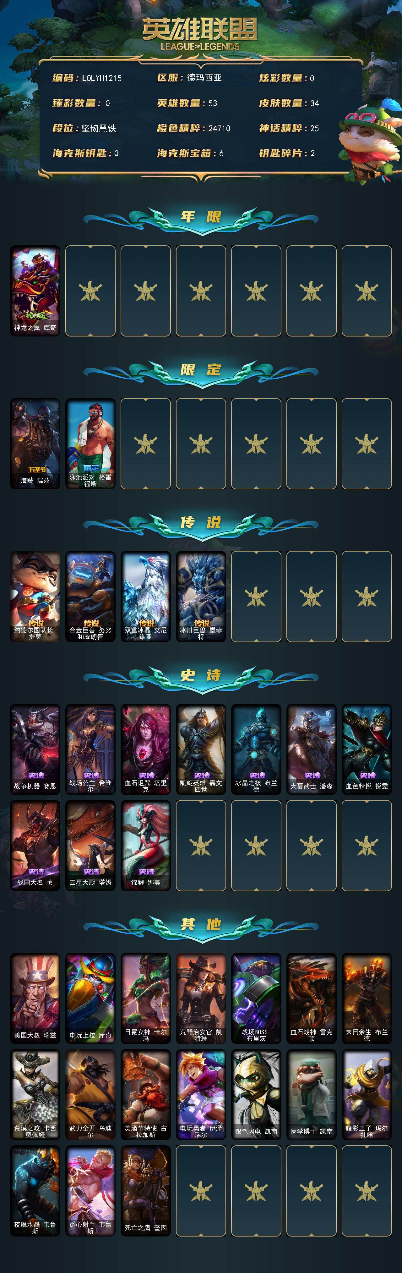 【421025】【LOLYH1215】53英雄/34皮肤/3限定/4传说/10史诗/未定级/神龙之翼库奇/海贼瑞兹/泳池派对格雷福斯/约德尔国队长提莫/合金巨兽努努和威朗普/双重冰晶艾尼维亚/冰川巨兽墨菲特/战争机器赛恩/战场公主希维尔/血石诅咒塔里克/凯旋英雄嘉文四世/冰晶之核布兰德/大夏武士潘森/血色精锐锐雯/战国大名慎/五星大厨塔姆/锦鲤娜美/美国大叔瑞兹/电玩上校库奇/日冕女神卡尔玛/荒