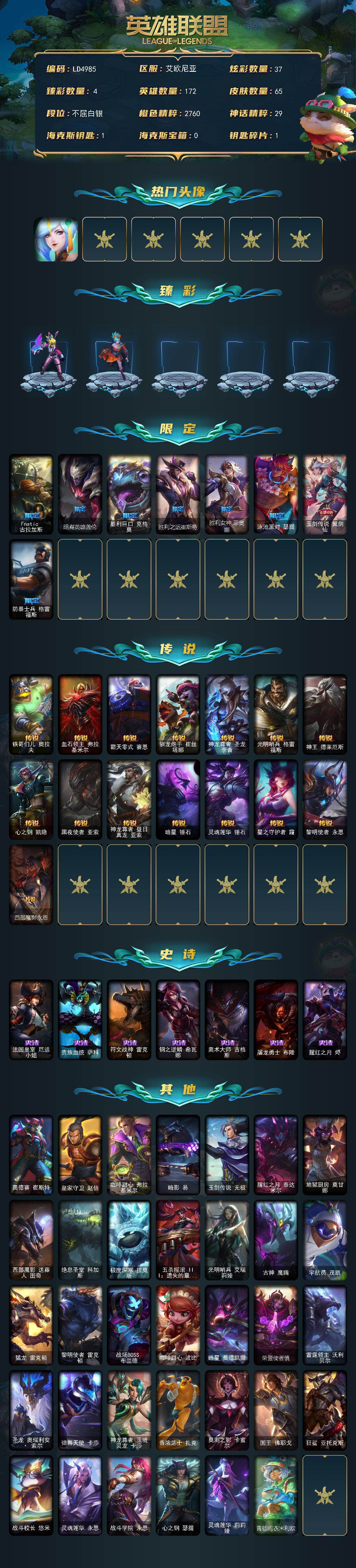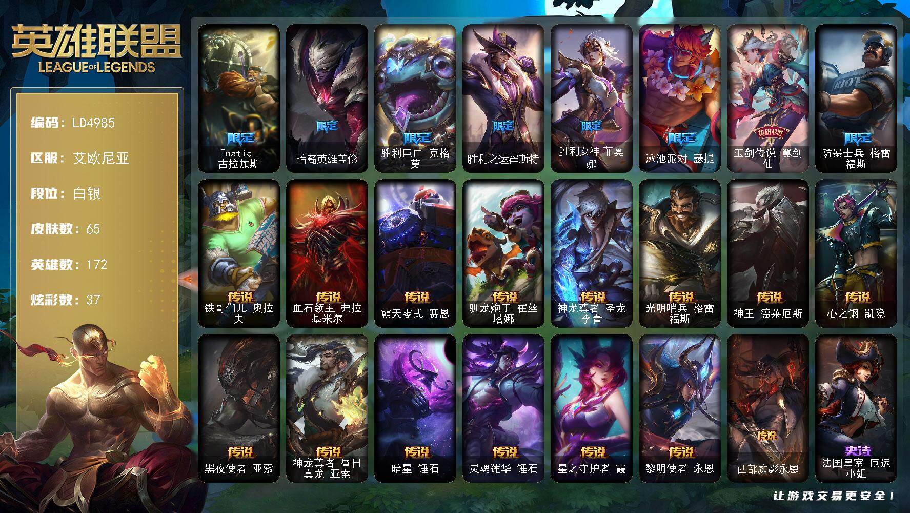 【421646】【LD4985】172英雄/65皮肤/9限定/4臻彩/37炫彩/15传说/7史诗/白银账号等级:260/春晖神女/幻灵战斗兔锐雯梦幻强袭/灵魂莲华锐雯流火/水晶玫瑰斯维因纯洁花蕾/黑夜使者嘉文四世白夜/Fnatic古拉加斯/暗裔英雄盖伦/胜利巨口克格莫/胜利之运崔斯特/胜利女神菲奥娜/泳池派对瑟提/玉剑传说翼剑仙/防暴士兵格雷福斯/铁哥们儿奥拉夫/血石领主弗拉基米尔/霸天零式赛恩
