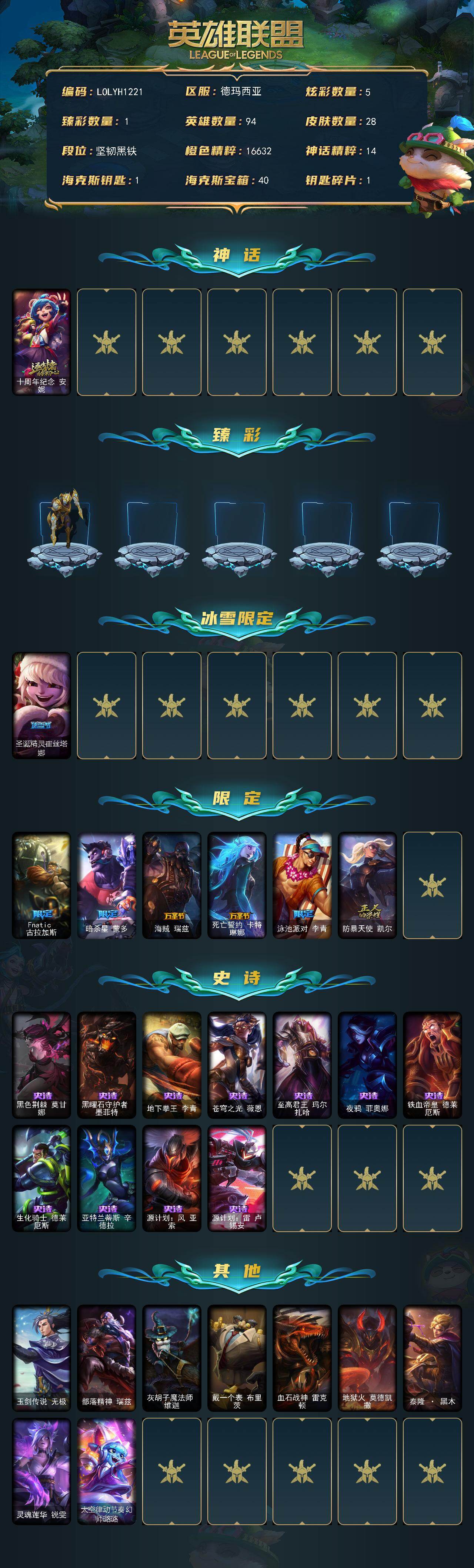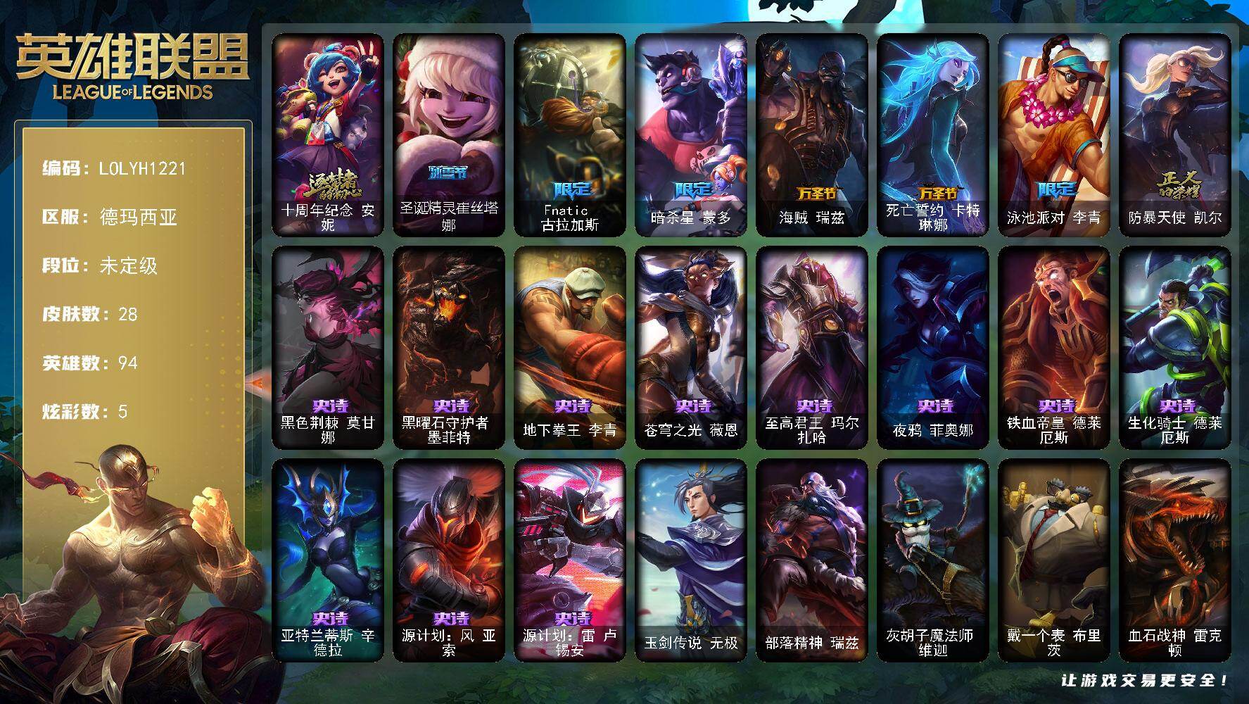 【422042】【LOLYH1221】94英雄/28皮肤/1神话/7限定/1臻彩/5炫彩/11史诗/未定级/十周年纪念安妮/冠军之隐劫凯旋圣装/圣诞精灵崔丝塔娜/Fnatic古拉加斯/暗杀星蒙多/海贼瑞兹/死亡誓约卡特琳娜/泳池派对李青/防暴天使凯尔/黑色荆棘莫甘娜/黑曜石守护者墨菲特/地下拳王李青/苍穹之光薇恩/至高君王玛尔扎哈/夜鸦菲奥娜/铁血帝皇德莱厄斯/生化骑士德莱厄斯/亚特兰蒂斯辛德拉