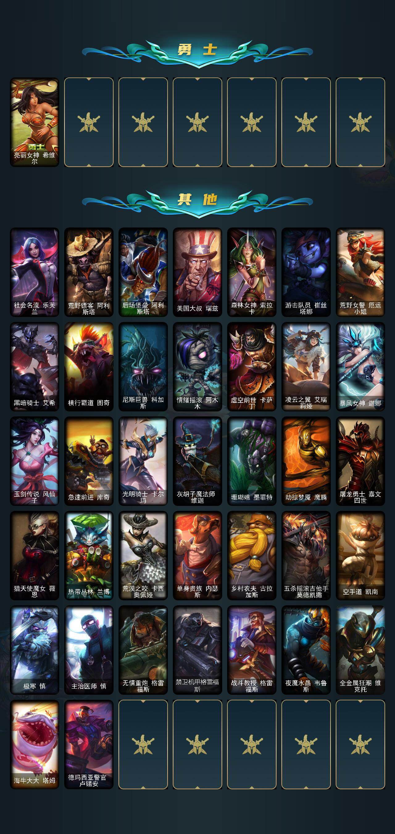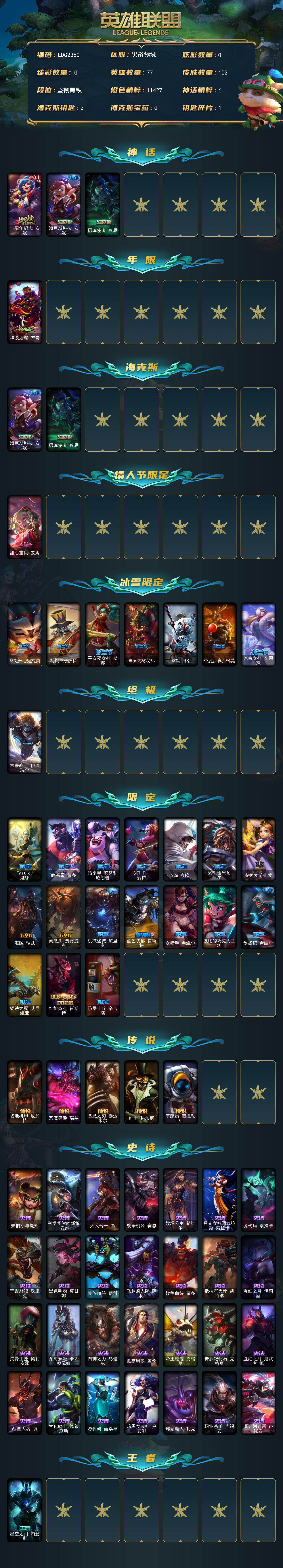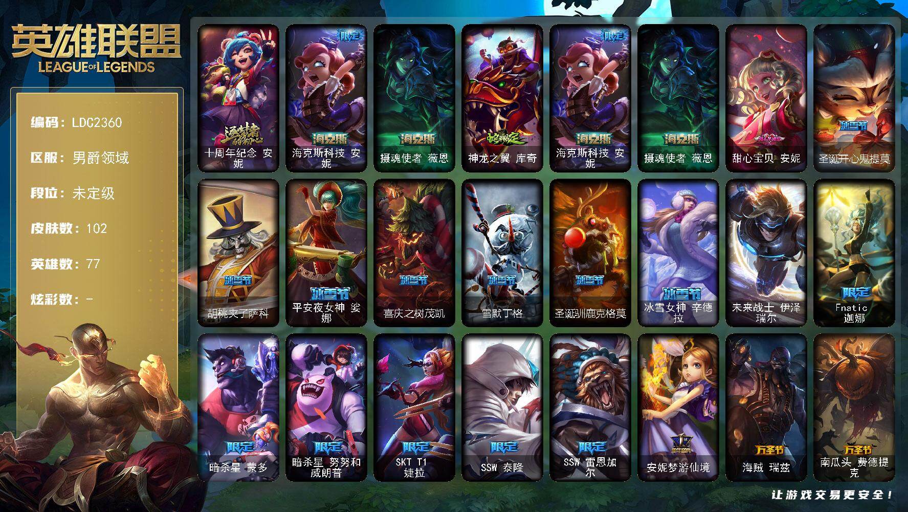 【422473】【LDC2360】77英雄/102皮肤/1终极/3神话/26限定/5传说/28史诗/未定级/十周年纪念安妮/海克斯科技安妮/摄魂使者薇恩/神龙之翼库奇/甜心宝贝安妮/圣诞开心鬼提莫/胡桃夹子萨科/平安夜女神娑娜/喜庆之树茂凯/雪默丁格/圣诞驯鹿克格莫/冰雪女神辛德拉/未来战士伊泽瑞尔/Fnatic迦娜/暗杀星蒙多/暗杀星努努和威朗普/SKTT1婕拉/SSW泰隆/SSW雷恩加尔/安
