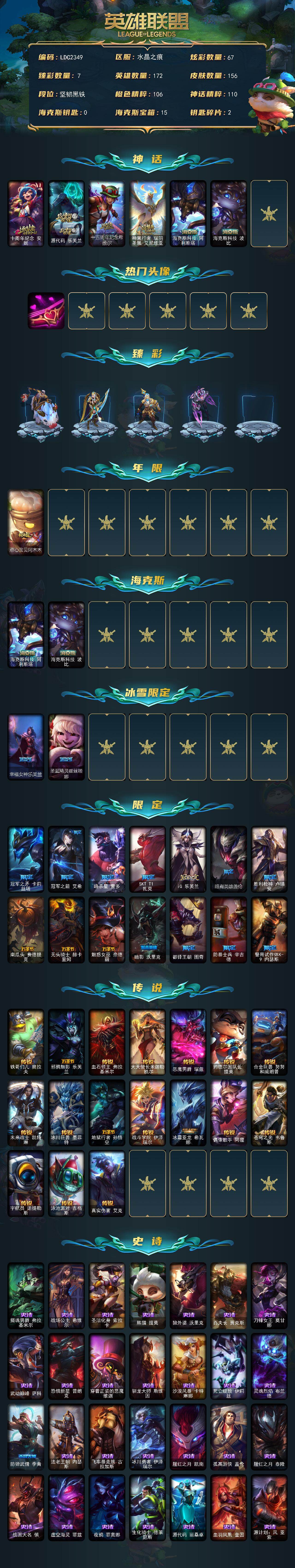 【422821】【LDC2349】172英雄/156皮肤/6神话/17限定/7臻彩/67炫彩/17传说/36史诗/未定级账号等级:307/十周年纪念安妮/源代码乐芙兰/十五周年纪念希维尔/神凰行者瑞羽凤凰艾尼维亚/海克斯科技阿利斯塔/海克斯科技波比/爱情之歌/无畏骑士瑟庄妮赤子初心/冠军之箭艾希凯旋圣装/冠军之志瑞兹凯旋圣装/天煞劫恒星游历者/战斗学院卡特琳娜盛典礼服/魔女阿卡丽虚荣/西部魔影执