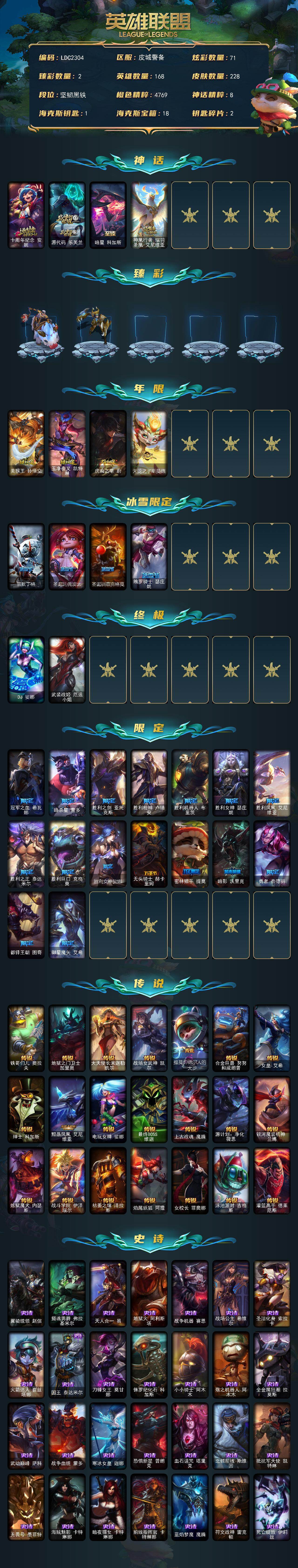 【422868】【LDC2304】168英雄/228皮肤/2终极/4神话/24限定/2臻彩/71炫彩/21传说/67史诗/未定级/十周年纪念安妮/源代码乐芙兰/暗星科加斯/神凰行者瑞羽凤凰艾尼维亚/无畏骑士瑟庄妮赤子初心/冠军之血希瓦娜凯旋圣装/美猴王孙悟空/玉净夜叉凯特琳/虎痴之拳蔚/天龙之子斯莫德/雪默丁格/圣诞玩偶波比/圣诞驯鹿克格莫/魄罗骑士瑟庄妮/DJ娑娜/武装战姬厄运小姐/冠军之血希