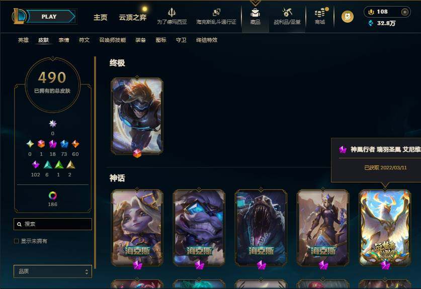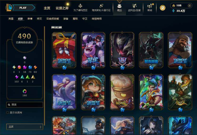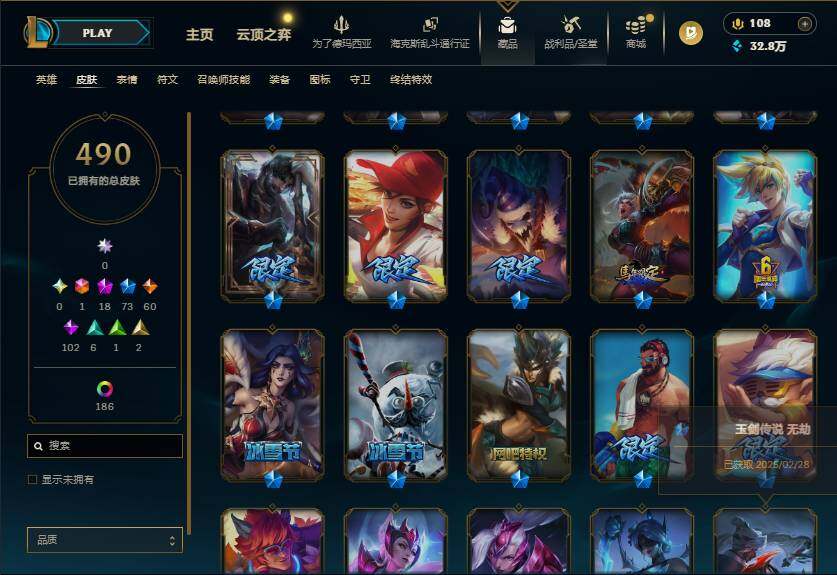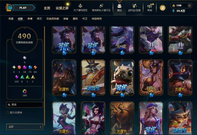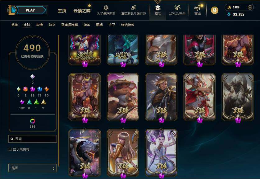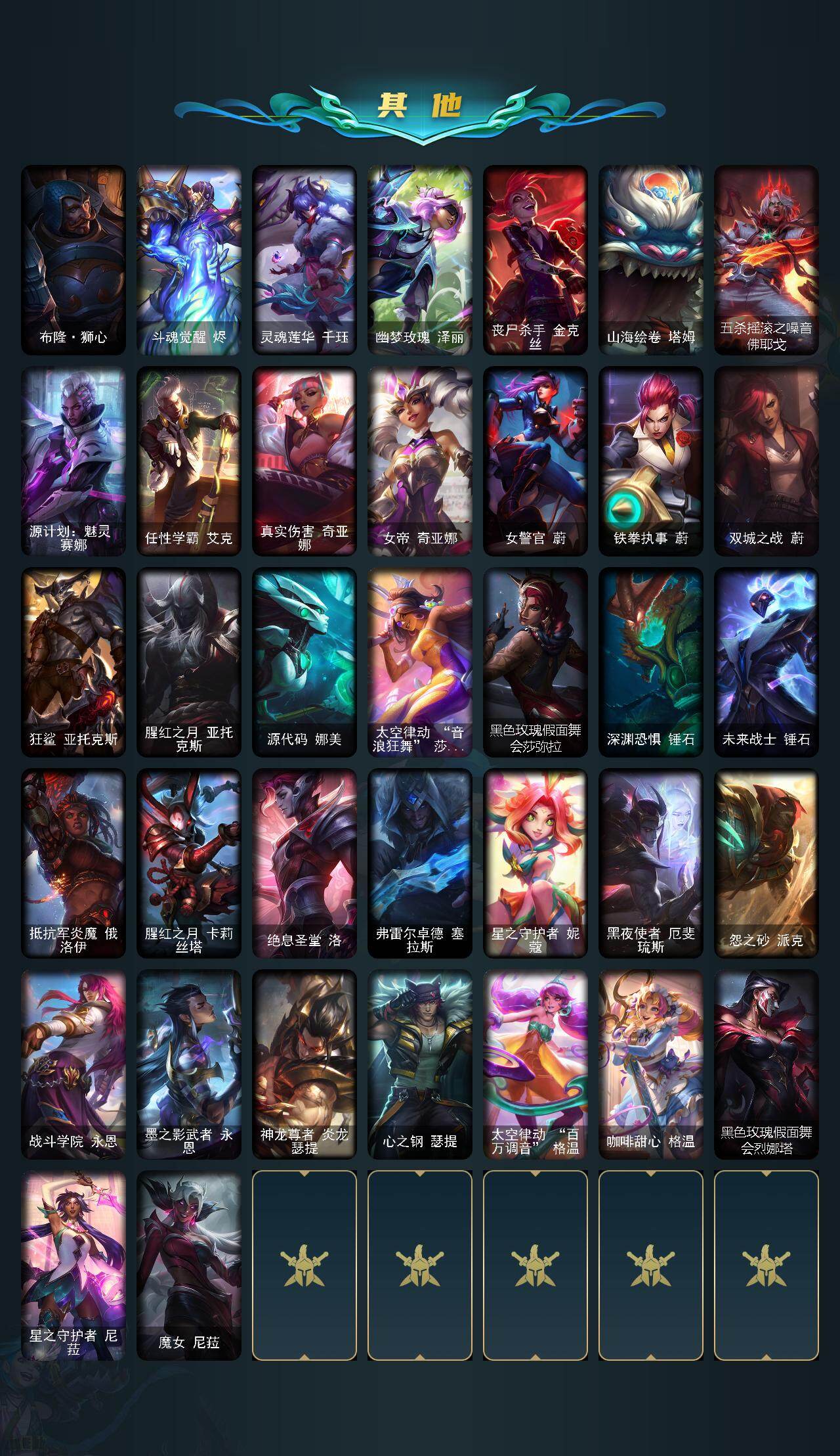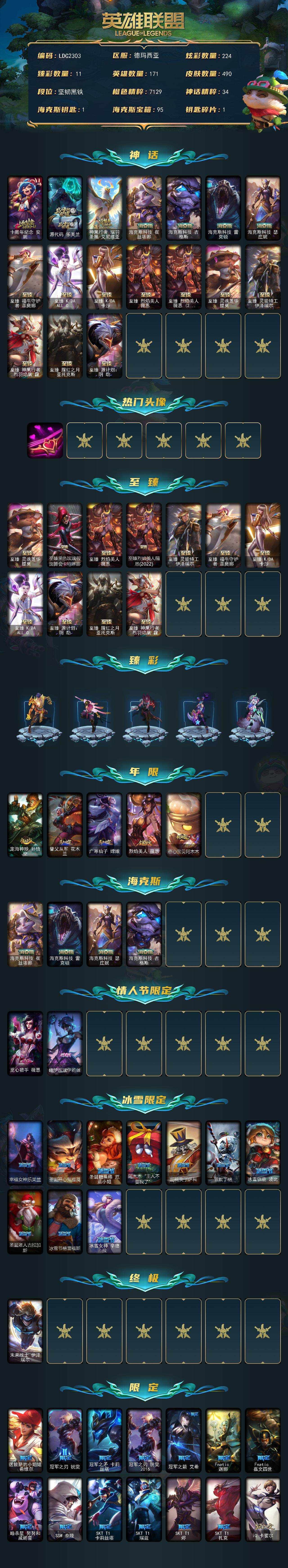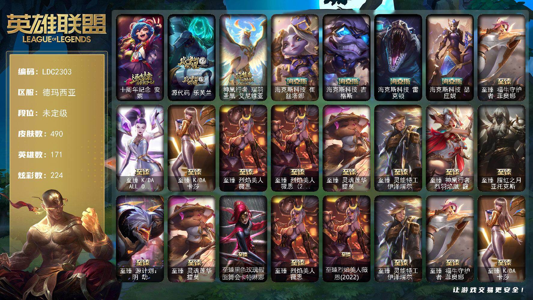 【422874】【LDC2303】171英雄/490皮肤/1终极/18神话/73限定/11臻彩/224炫彩/60传说/102史诗/未定级/十周年纪念安妮/源代码乐芙兰/神凰行者瑞羽凤凰艾尼维亚/海克斯科技崔丝塔娜/海克斯科技吉格斯/海克斯科技雷克顿/海克斯科技瑟庄妮/至臻福牛守护者菲奥娜/至臻K/DAALLOUT卡莎/至臻K/DA卡莎/至臻烈焰美人薇恩/至臻烈焰美人薇恩(2022)/至臻灵魂莲华