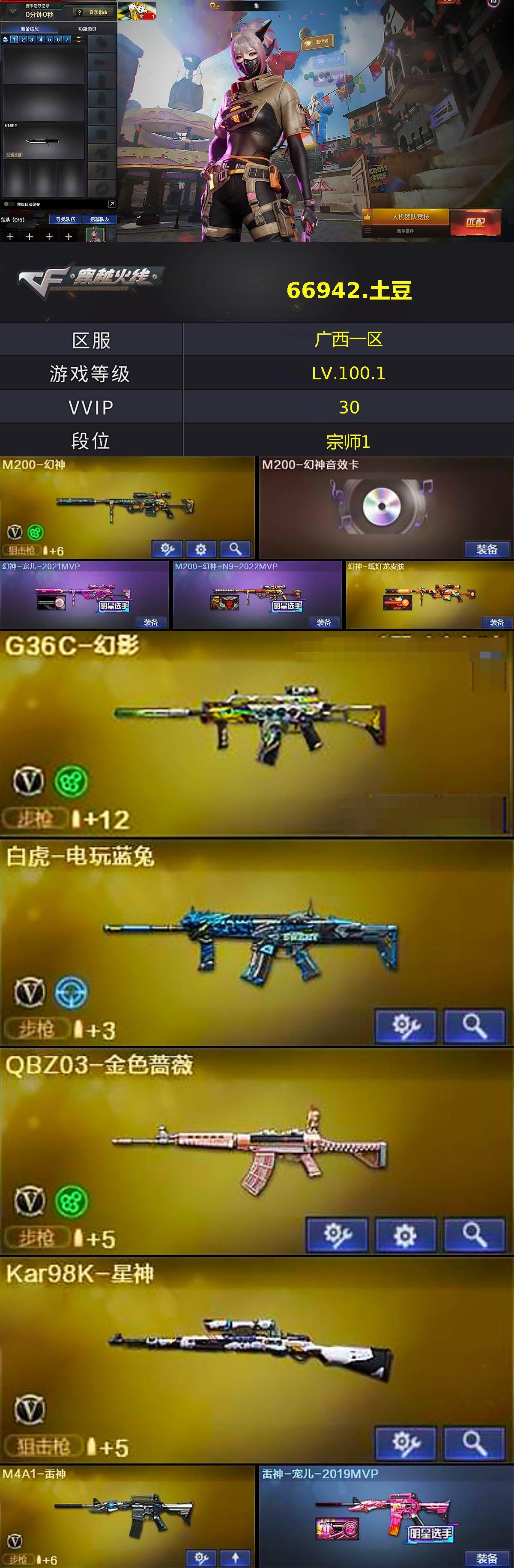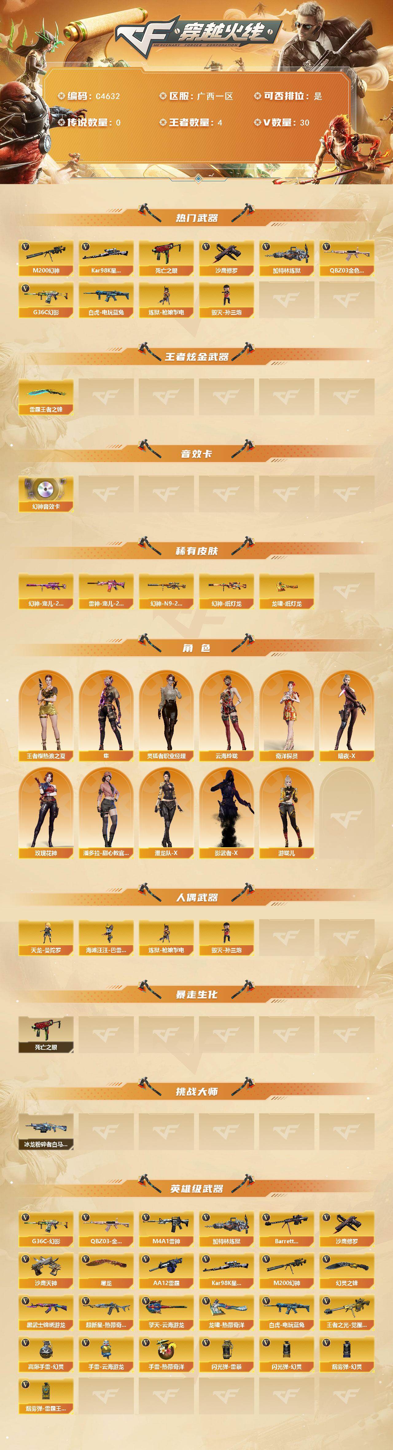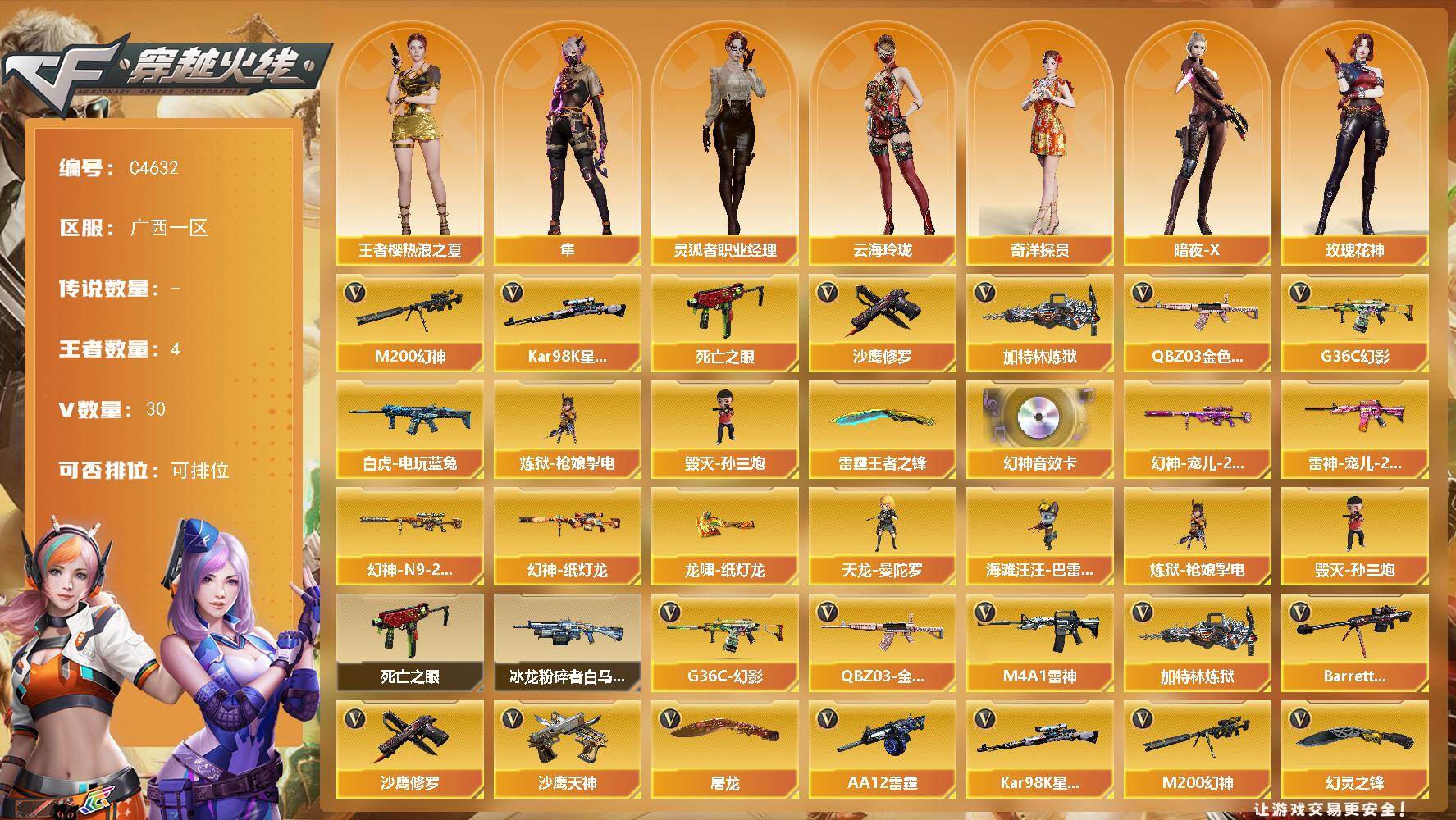 【423447】【423447】【C4632】广西一区-29V-4王者武器数-0炫金武器数【热门武器】:G36C-幻影,QBZ03-金色蔷薇,M200-幻神,