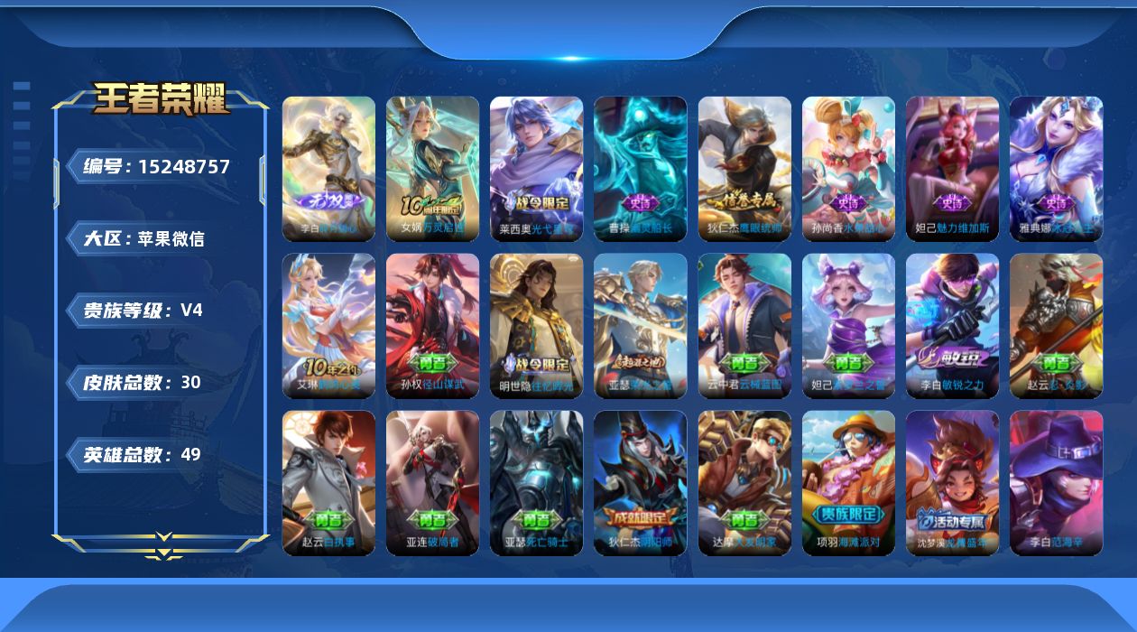 【423747】【可二次】【微信(苹果)】不知火舞 冰冠公主 碧珀绯影 鹰眼统帅 尼罗河女神 白执事 水果甜心 阴阳师 忍·炎影 赤焰之缨 龙域领主 幽灵船长 死亡骑士 碎月剑心 敏锐之力 破局者 紫罗兰之誓 大发明家 海滩派对 范海辛